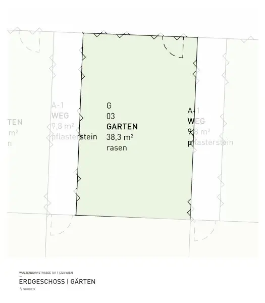 Für alle Eigentümer, auch in den oberen Geschossen, offeriert sich die besondere optionale Möglichkeit eines eigenen Gartenabteils. Alle Gärten werden mit Strom- und Wasseranschluss ausgeführt.
