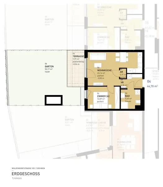 Das in Bau befindliche Wohnbauprojekt in der Wulzendorfstraße 103, 1220 Wien verfügt über 61 provisionsfreie Eigentumswohnungen auf Eigengrund in den Größen 33 m² bis 101 m² mit 1 bis 4 Zimmer sowie 2 Büroflächen. Es stehen für alle Wohnungen private Freiflächen wie Dachterrassen, Terrassen, Loggien, Balkone und Eigengärten zur Verfügung. Die Wärmeversorgung erfolgt über Luft-Wärme-Pumpe.