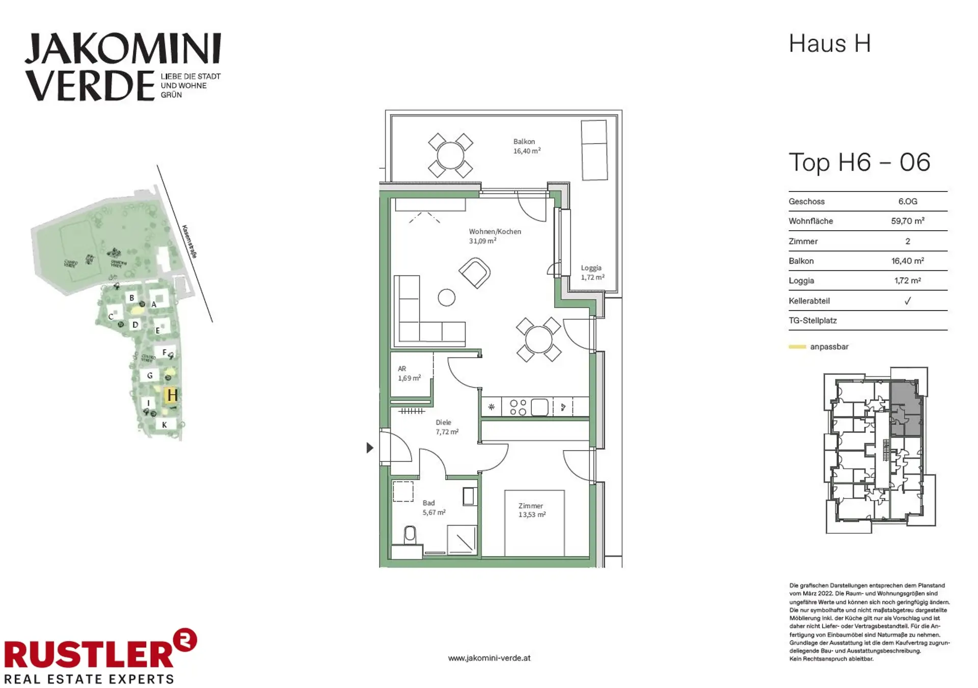 JAKOMINI VERDE - PROVISIONSFREI Modern, hochwertig, nachhaltig - Ihr neues Zuhause im Graz-Jakomini! Entdecken Sie Ihre Traumwohnung im Wohnungsfinder!Jakomini Verde ist ein modernes und nachhaltiges Wohnprojekt im Herzen von Graz, das urbanes Leben mit einer grünen, ruhigen Umgebung vereint. Das gesamte Quartier setzt auf nachhaltige Bauweise und umweltfreundliche Energieversorgung. Durch eine Wasser/Wasser-Wärmepumpe wird das Gebäude effizient beheizt. Zusätzlich wird Fernwärme zur Warmwasserbereitung genutzt, wodurch die Wohneinheiten in den kalten Monaten optimal beheizt und in den heißen Sommermonaten angenehm temperiert werden. Highlights - Moderne Architektur – Lichtdurchflutete Räume, bodentiefe Fenster - Freiflächen für jede Wohnung – Balkon oder Loggia inklusive - Hochwertige Ausstattung – Parkett, Fußbodenheizung, 3-fach-Verglasung - Nachhaltiges Energiekonzept – Wärmepumpe, Fernwärme, PV-Anlage (Mieterstrommodell) - Top-Infrastruktur – Öffis, Einkaufsmöglichkeiten, Naherholung in direkter Nähe - Fahrradfreundlich – direkte Anbindung an das Radwegenetz - Komfort & Barrierefreiheit – Lift, stufenloser Zugang, Tiefgarage verfügbar Wohnungsbeschreibung: Die Top H6-06 ist ca. 59,70 m² groß, befindet sich im 6. Stock und hat folgende Räumlichkeiten: - Vorraum - Wohnküche - Schlafzimmer - Badezimmer mit Dusche und WC - Abstellraum - Balkon - Kellerabteil - Tiefgaragenplatz (optional)Lage und Infrastruktur: Die Lage von Jakomini Verde könnte nicht besser sein: Die Mur und der Augartenpark mit dem Augartenbad liegen praktisch vor der Tür und bieten zahlreiche Freizeitmöglichkeiten. Der Jakominiplatz ist schnell erreichbar und auch diverse Einkaufsmöglichkeiten sowie Restaurants und Cafés liegen in der Umgebung. Das Quartier ist perfekt in das Radwegenetz der Stadt eingebunden, wodurch umweltfreundliche Mobilität einfach und schnell möglich ist. Hier verbinden sich urbanes Leben und Natur zu einem idealen Zuhause. Beziehbar: ab sofort Überzeugen Sie sich im Zuge einer Besichtigung!