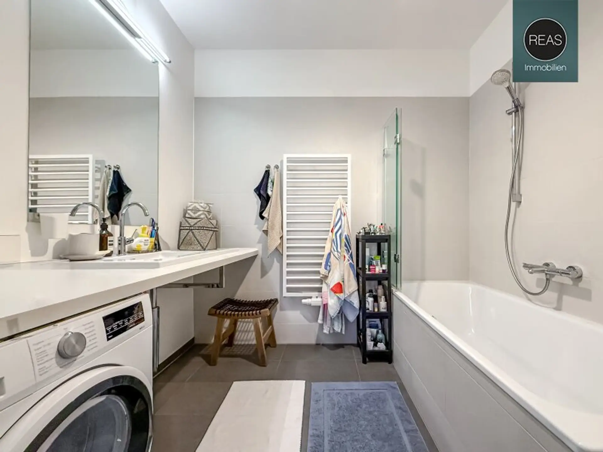 * 1 Badezimmer mit Badewanne mit Glas-Duschwand, Waschbecken mit Spiegel und Beleuchtung, Handtuchheizkörper sowie einem Waschmaschinenanschluss