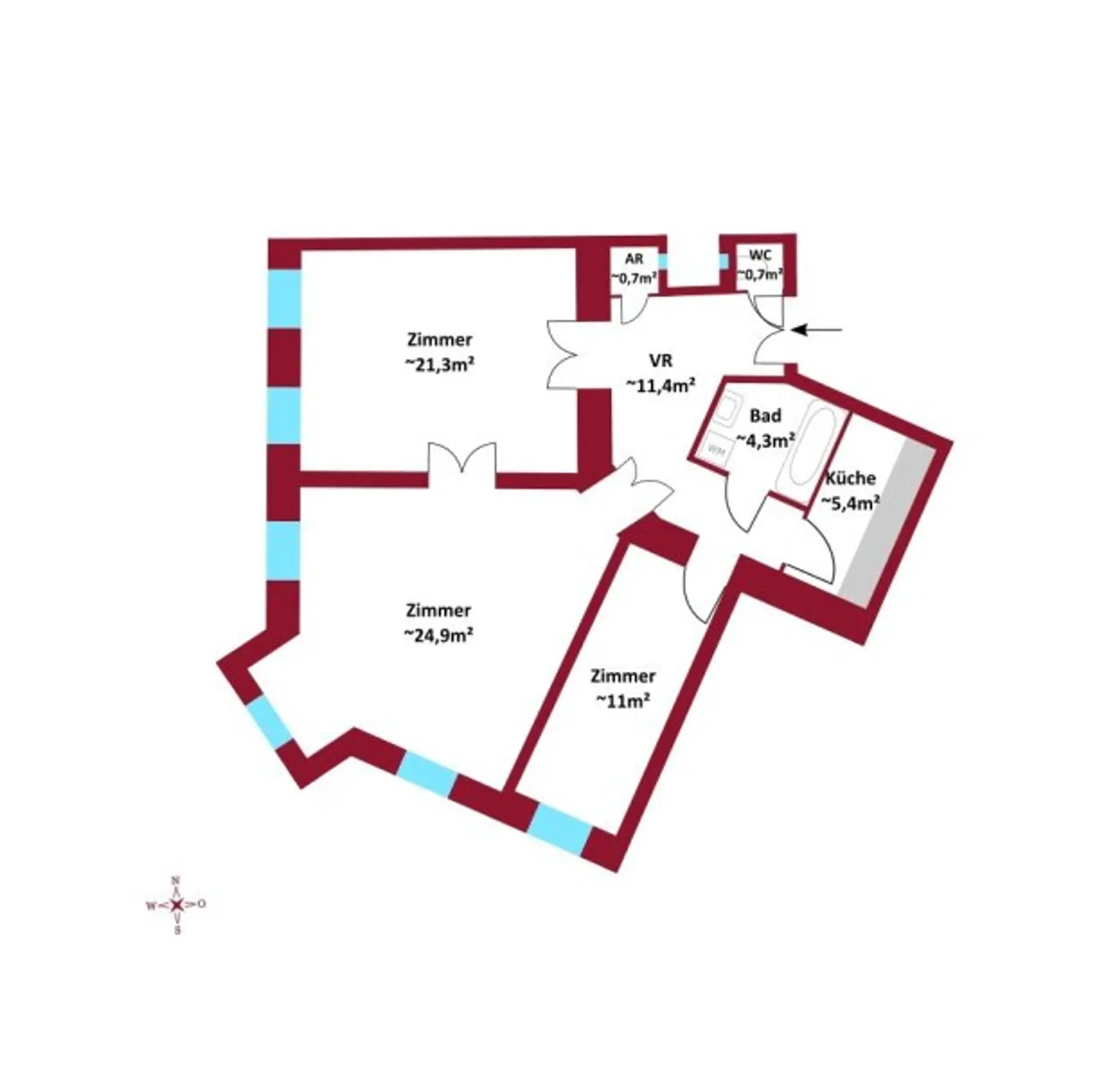 Die 3 Zi. Wohnung teilt sich wie folgt auf:
