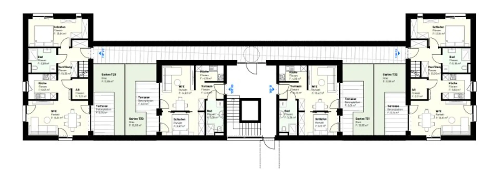 Zur Ausstattung gehören Echtholzparkettböden in Wohn- und Schlafräumen, großflächige Fenster mit 3-fach-Isolierverglasung, elektrische Rolladen, Fußbodenheizung in allen Räumen sowie Sanitärausstattung mit Markenprodukten von Laufen und Grohe. Bodengleiche Duschen und Eckbadewannen sind je nach Wohnung vorhanden. Die Terrassen sind mit Betonplatten und Glasgeländern versehen. Ein Kellerabteil ist inklusive, ebenso eine zentrale Zentralschließanlage. Ein Tiefgaragenplatz kann separat erworben werden.