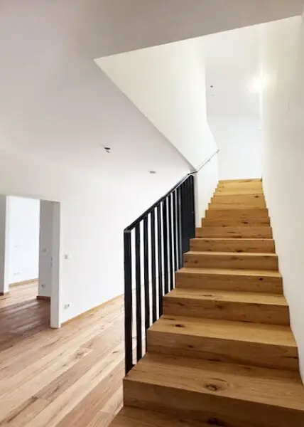Der offene Wohn- und Essbereich bildet das Zentrum der Wohnung und bietet direkten Zugang zur Terrasse und zum privaten Garten. Über eine interne Treppe gelangen Sie in die obere Ebene, die weitere Zimmer für Schlafzimmer, Kinderzimmer oder Homeoffice bietet. Große Fenster sorgen für viel Tageslicht und ein offenes Ambiente.