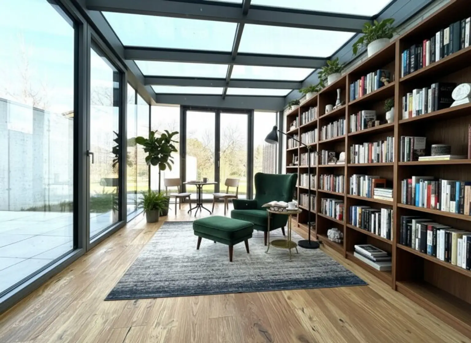 edles Eichenparkett und großformatige Feinsteinzeugfliesen