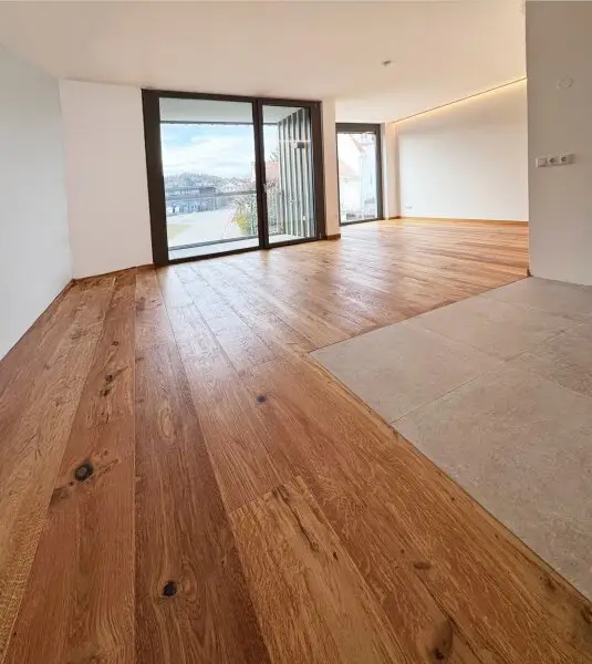 edles Eichenparkett und großformatige Feinsteinzeugfliesen