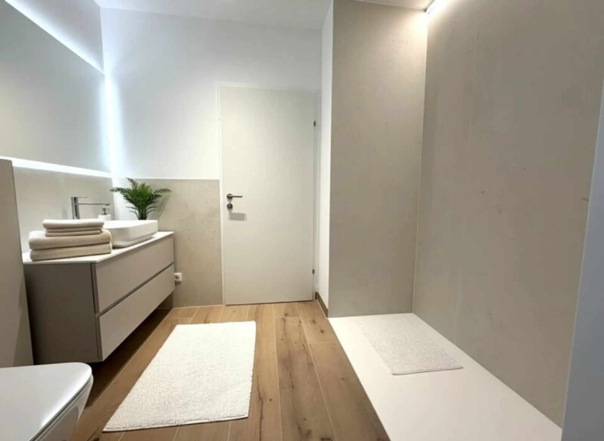 edles Eichenparkett und großformatige Feinsteinzeugfliesen
