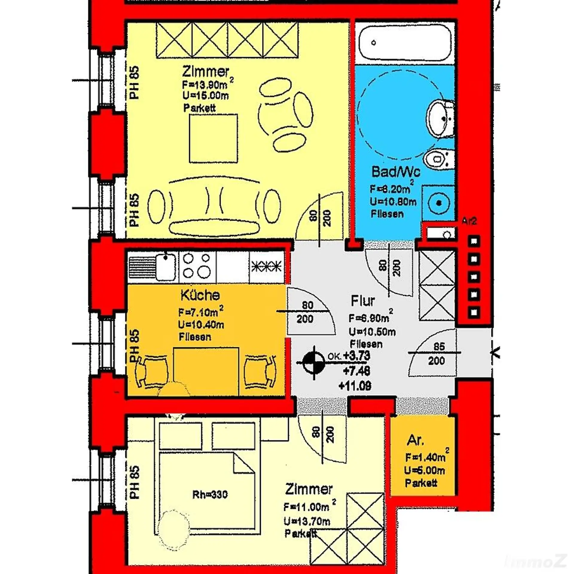 Sie besteht aus Diele mit Abstellnische, möblierter Küche, zwei extra begehbaren Zimmern und Wannenbad mit WC.