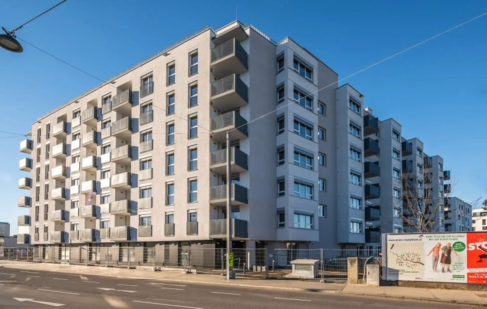 Das Wohnhaus gliedert sich in 3 Bauteile (Stiege A, B und C) zu je 7 Stockwerken. Insgesamt stehen 167 freifinanzierte Wohnungen zur provisionsfreien Vermietung zur Verfügung.