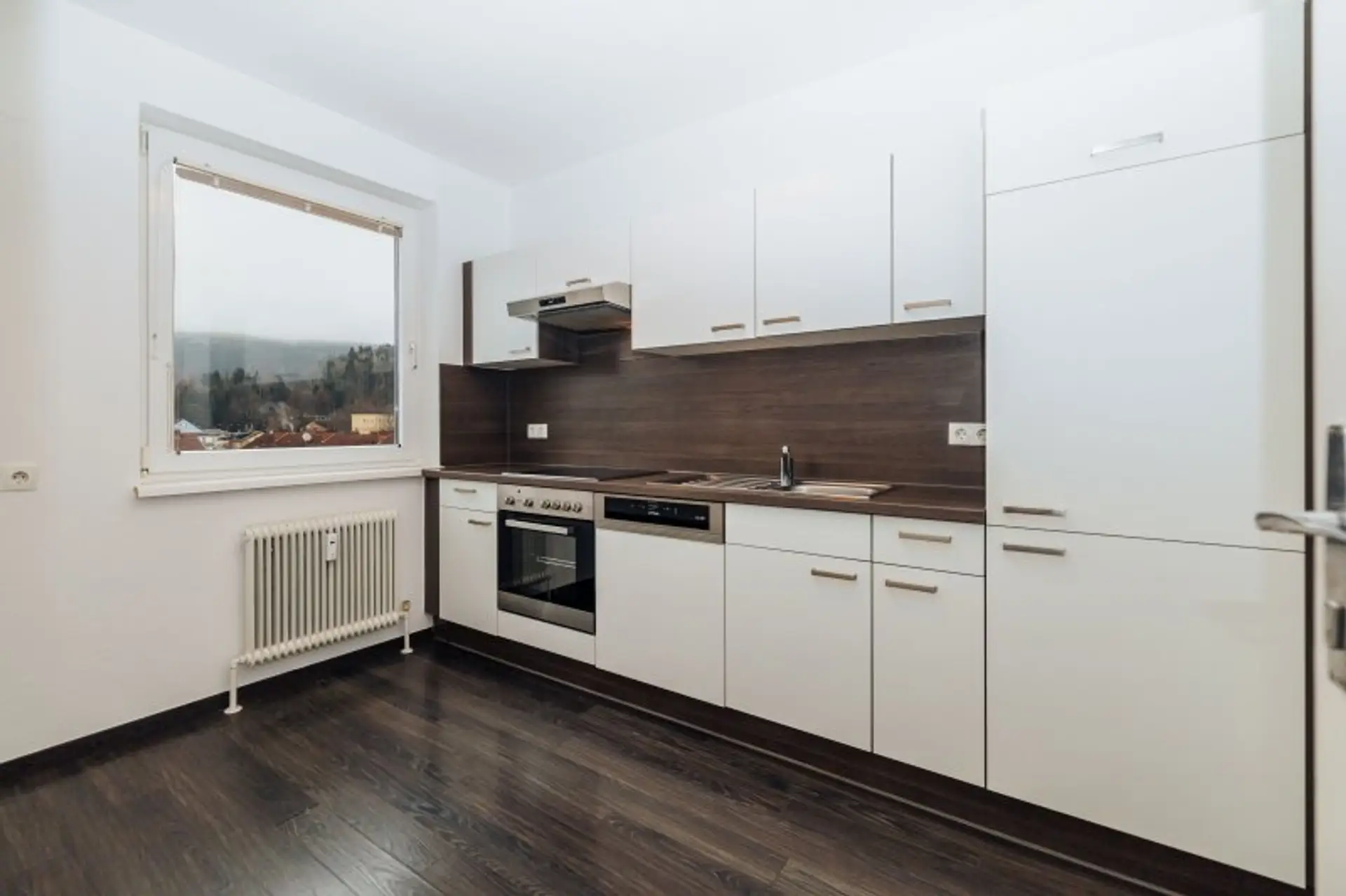Die separate Küche ist mit Ceranfeld, E-Herd, Geschirrspüler und Kühlschrank ausgestattet – praktisch, gepflegt und bereit zum Kochen.