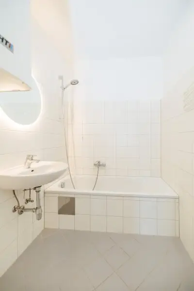 Das Wohnzimmer öffnet sich zur südlich ausgerichteten Loggia – ein echtes Highlight mit Blick ins Grüne und Sonne von früh bis spät. Die Küche ist voll ausgestattet und bietet ausreichend Raum für den Essbereich. Das Badezimmer verfügt über eine Badewanne, ein Waschbecken sowie einen Waschmaschinenanschluss.