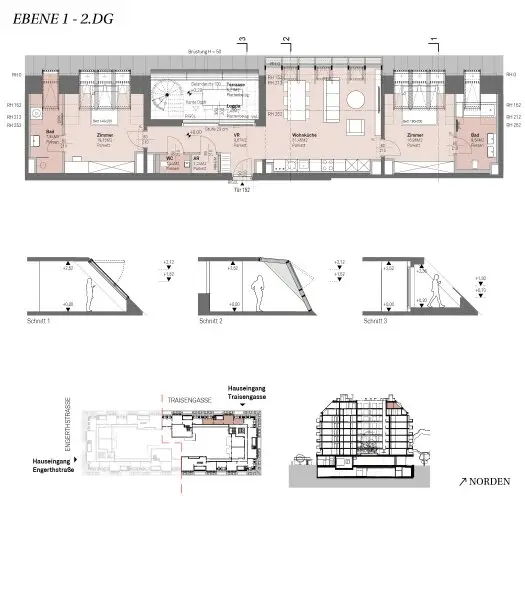 Die modernen 2-Zimmer-Wohnungen sind ideal für Singles und Paare. Mit 37 bis 45 m² vereinen sie einen offenen Wohn-/Essbereich, ein separates Schlafzimmer sowie Zugang zur Terrasse oder zum eigenen Garten. Höchsten Wohnkomfort bieten auch die Maisonette-, Garten- und Hofwohnungen mit 3 oder 4 Zimmern. Die Gartenwohnungen verfügen über private Grünflächen, während Hofwohnungen direkten Zugang zum begrünten Innenhof haben. Die Dachgeschoßwohnungen und Penthouses bieten luxuriöses Wohnen mit 43 bis 126 m² und 2 bis 4 Zimmern. Atemberaubende Ausblicke und ein begehrter Rückzugsort im Herzen der Stadt zeichnen diese Einheiten aus.