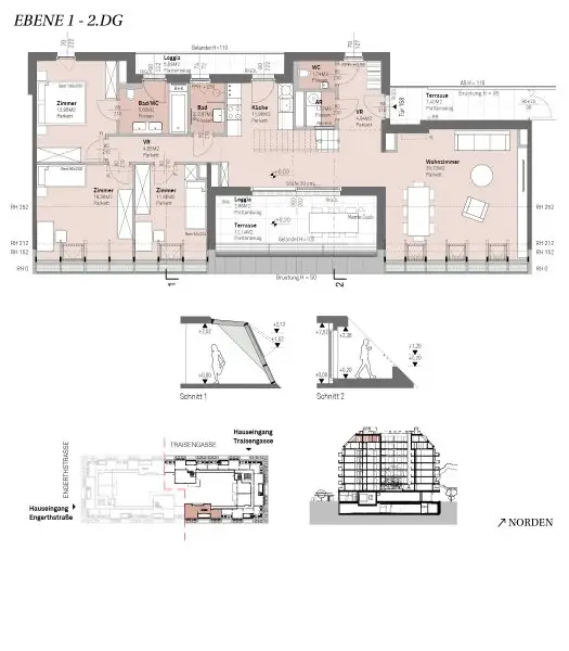 Die modernen 2-Zimmer-Wohnungen sind ideal für Singles und Paare. Mit 37 bis 45 m² vereinen sie einen offenen Wohn-/Essbereich, ein separates Schlafzimmer sowie Zugang zur Terrasse oder zum eigenen Garten. Höchsten Wohnkomfort bieten auch die Maisonette-, Garten- und Hofwohnungen mit 3 oder 4 Zimmern. Die Gartenwohnungen verfügen über private Grünflächen, während Hofwohnungen direkten Zugang zum begrünten Innenhof haben. Die Dachgeschoßwohnungen und Penthouses bieten luxuriöses Wohnen mit 43 bis 126 m² und 2 bis 4 Zimmern. Atemberaubende Ausblicke und ein begehrter Rückzugsort im Herzen der Stadt zeichnen diese Einheiten aus.