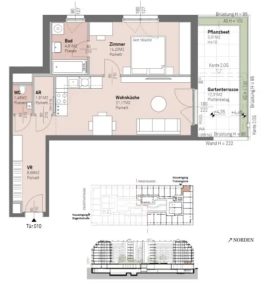 Die modernen 2-Zimmer-Wohnungen sind ideal für Singles und Paare. Mit 37 bis 45 m² vereinen sie einen offenen Wohn-/Essbereich, ein separates Schlafzimmer sowie Zugang zur Terrasse oder zum eigenen Garten. Höchsten Wohnkomfort bieten auch die Maisonette-, Garten- und Hofwohnungen mit 3 oder 4 Zimmern. Die Gartenwohnungen verfügen über private Grünflächen, während Hofwohnungen direkten Zugang zum begrünten Innenhof haben. Die Dachgeschoßwohnungen und Penthouses bieten luxuriöses Wohnen mit 43 bis 126 m² und 2 bis 4 Zimmern. Atemberaubende Ausblicke und ein begehrter Rückzugsort im Herzen der Stadt zeichnen diese Einheiten aus.