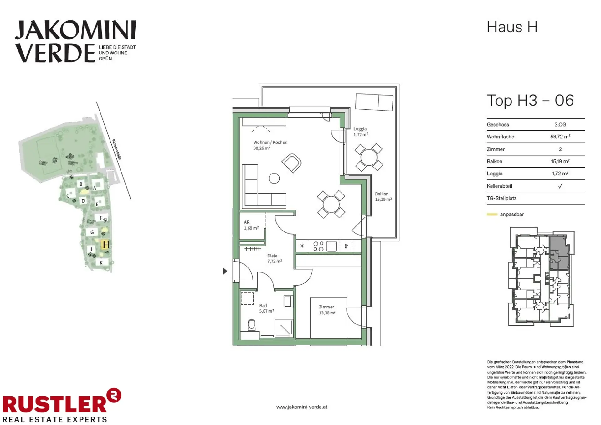 JAKOMINI VERDE - PROVISIONSFREI Modern, hochwertig, nachhaltig - Ihr neues Zuhause im Graz-Jakomini! Entdecken Sie Ihre Traumwohnung im Wohnungsfinder!Jakomini Verde ist ein modernes und nachhaltiges Wohnprojekt im Herzen von Graz, das urbanes Leben mit einer grünen, ruhigen Umgebung vereint. Das gesamte Quartier setzt auf nachhaltige Bauweise und umweltfreundliche Energieversorgung. Durch eine Wasser/Wasser-Wärmepumpe wird das Gebäude effizient beheizt. Zusätzlich wird Fernwärme zur Warmwasserbereitung genutzt, wodurch die Wohneinheiten in den kalten Monaten optimal beheizt und in den heißen Sommermonaten angenehm temperiert werden. Highlights - Moderne Architektur – Lichtdurchflutete Räume, bodentiefe Fenster - Freiflächen für jede Wohnung – Balkon oder Loggia inklusive - Hochwertige Ausstattung – Parkett, Fußbodenheizung, 3-fach-Verglasung - Nachhaltiges Energiekonzept – Wärmepumpe, Fernwärme, PV-Anlage (Mieterstrommodell) - Top-Infrastruktur – Öffis, Einkaufsmöglichkeiten, Naherholung in direkter Nähe - Fahrradfreundlich – direkte Anbindung an das Radwegenetz - Komfort & Barrierefreiheit – Lift, stufenloser Zugang, Tiefgarage verfügbar Wohnungsbeschreibung: Die Top H3-06 ist ca. 58,72 m² groß, befindet sich im 3. Stock und hat folgende Räumlichkeiten: - Vorraum - Wohnküche - Schlafzimmer - Badezimmer mit Dusche und WC - Abstellraum - Balkon - Kellerabteil - Tiefgaragenplatz (optional)Lage und Infrastruktur: Die Lage von Jakomini Verde könnte nicht besser sein: Die Mur und der Augartenpark mit dem Augartenbad liegen praktisch vor der Tür und bieten zahlreiche Freizeitmöglichkeiten. Der Jakominiplatz ist schnell erreichbar und auch diverse Einkaufsmöglichkeiten sowie Restaurants und Cafés liegen in der Umgebung. Das Quartier ist perfekt in das Radwegenetz der Stadt eingebunden, wodurch umweltfreundliche Mobilität einfach und schnell möglich ist. Hier verbinden sich urbanes Leben und Natur zu einem idealen Zuhause. Beziehbar: ab sofort Überzeugen Sie sich im Zuge einer Besichtigung!