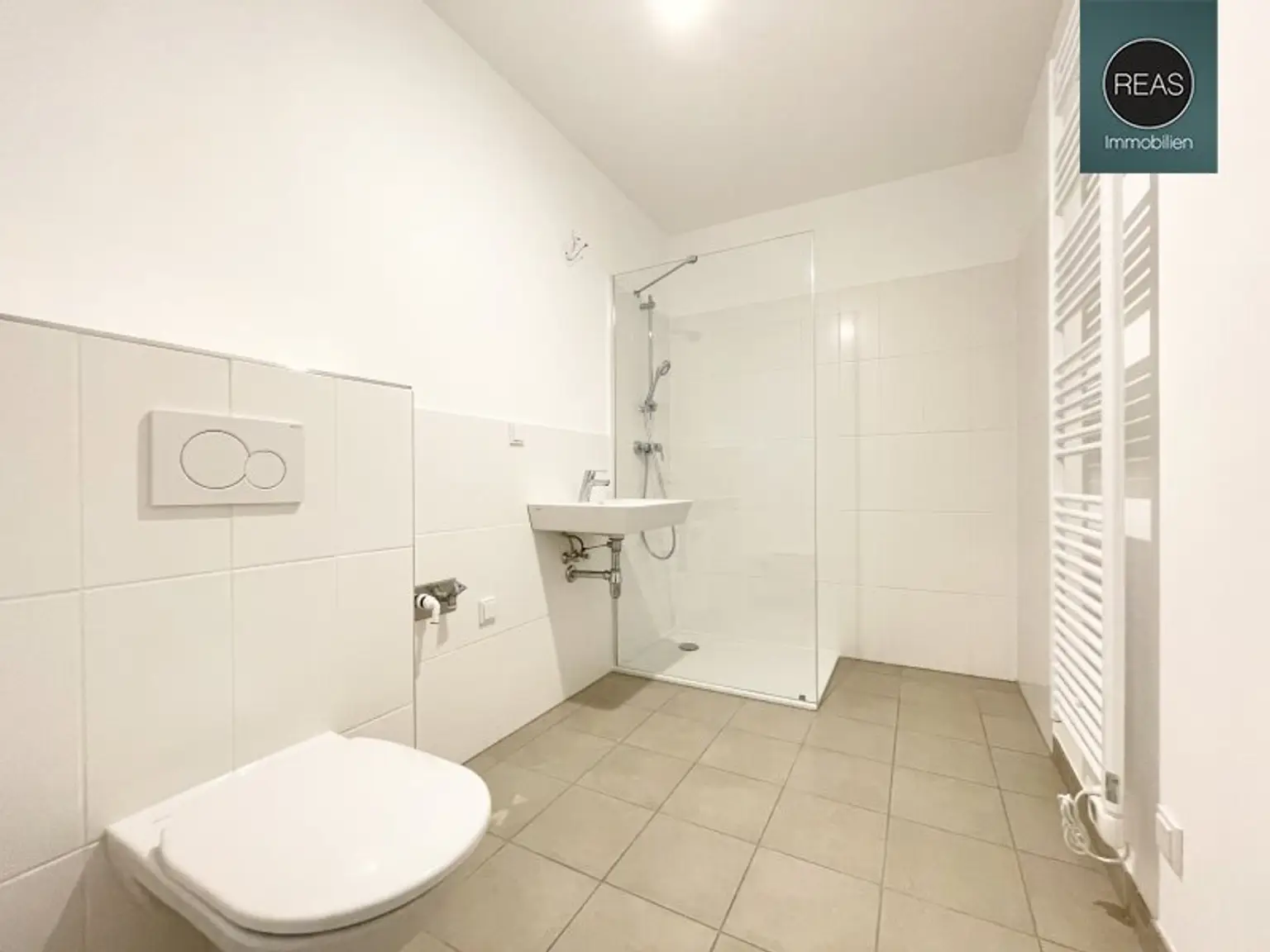 * 1 BAD mit WC, Waschbecken, Dusche mit Glaswand, Handtuchheizkörper, Waschmaschinenanschluss