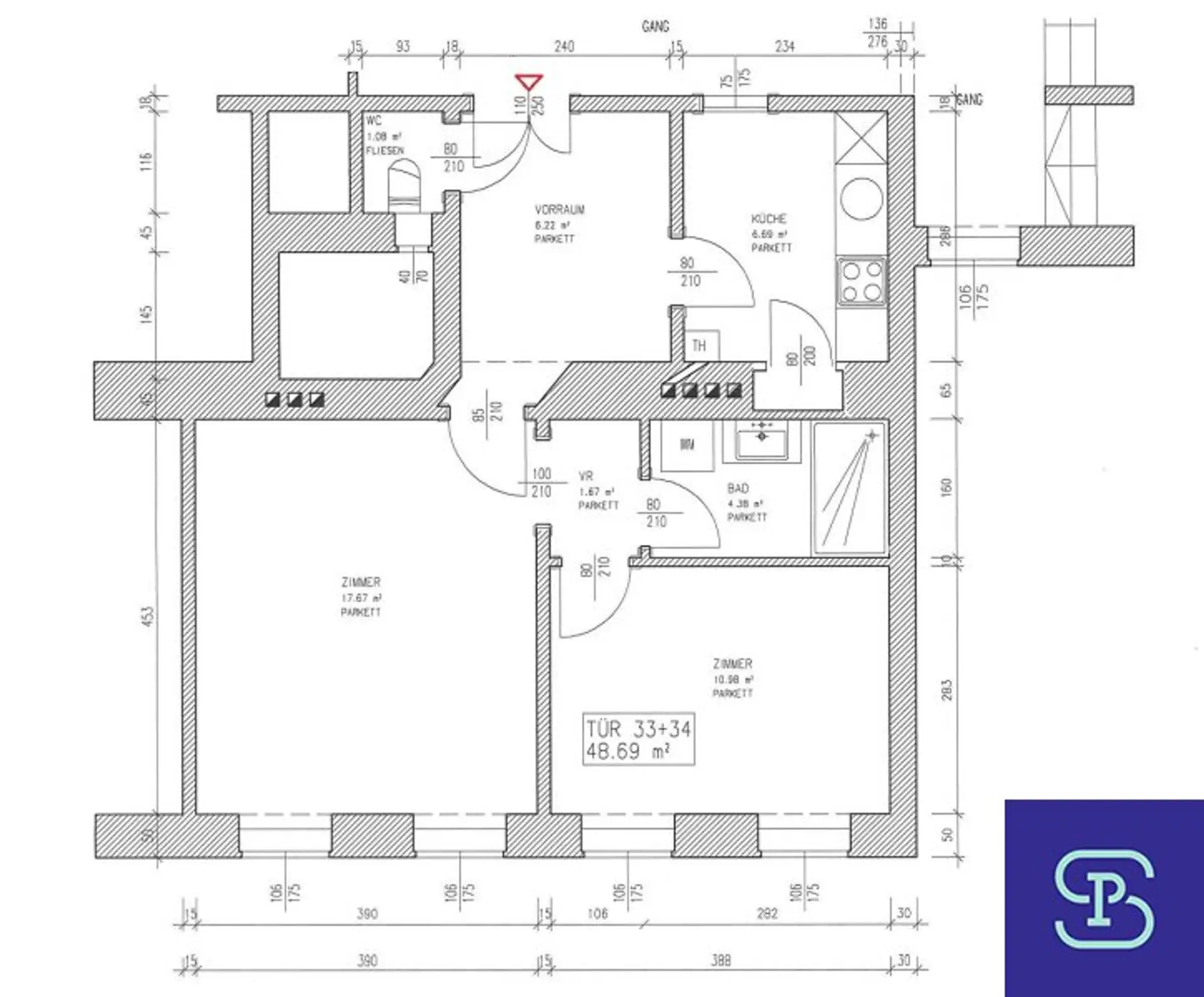 Ausstattung: Einbauküche mit Geräten, Gasetagenheizung, Fliesenbad mit Dusche, Kunststofffenster mit Mehrfachverglasung, Parkettböden, Sprechanlage, Kabel-TV u. Internet-Vorbereitung,.