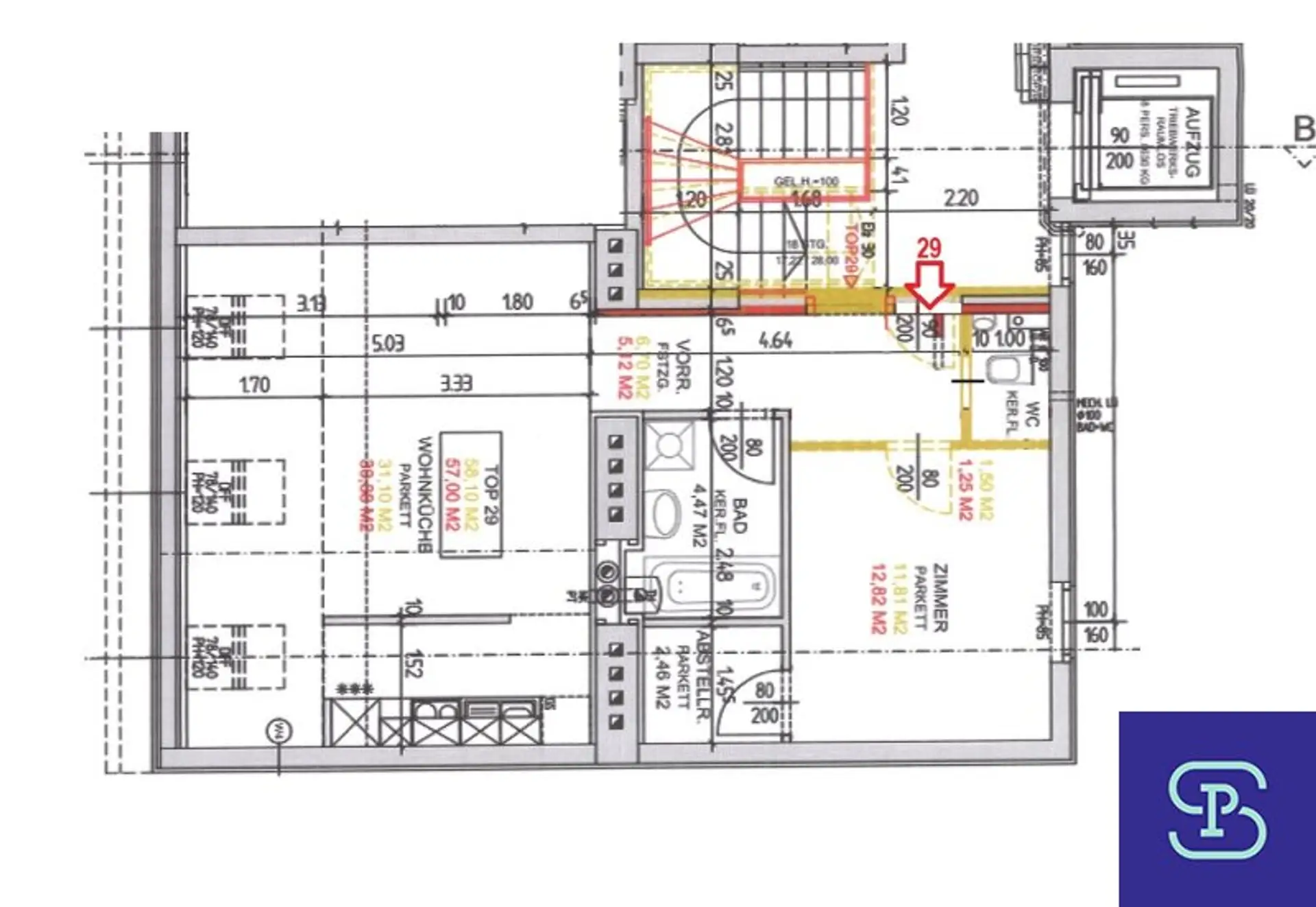 Ausstattung: Moderne Einbauküche mit Geräten, Parkettböden, Gasetagenheizung, Badezimmer mit Wanne und WM-Anschluss, Fenster mit Mehrfachverglasung, Lift, Sprechanlage, Kabel-TV u. Internet-Vorbereitung,.