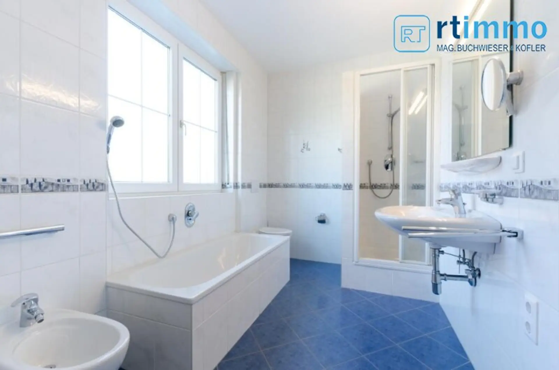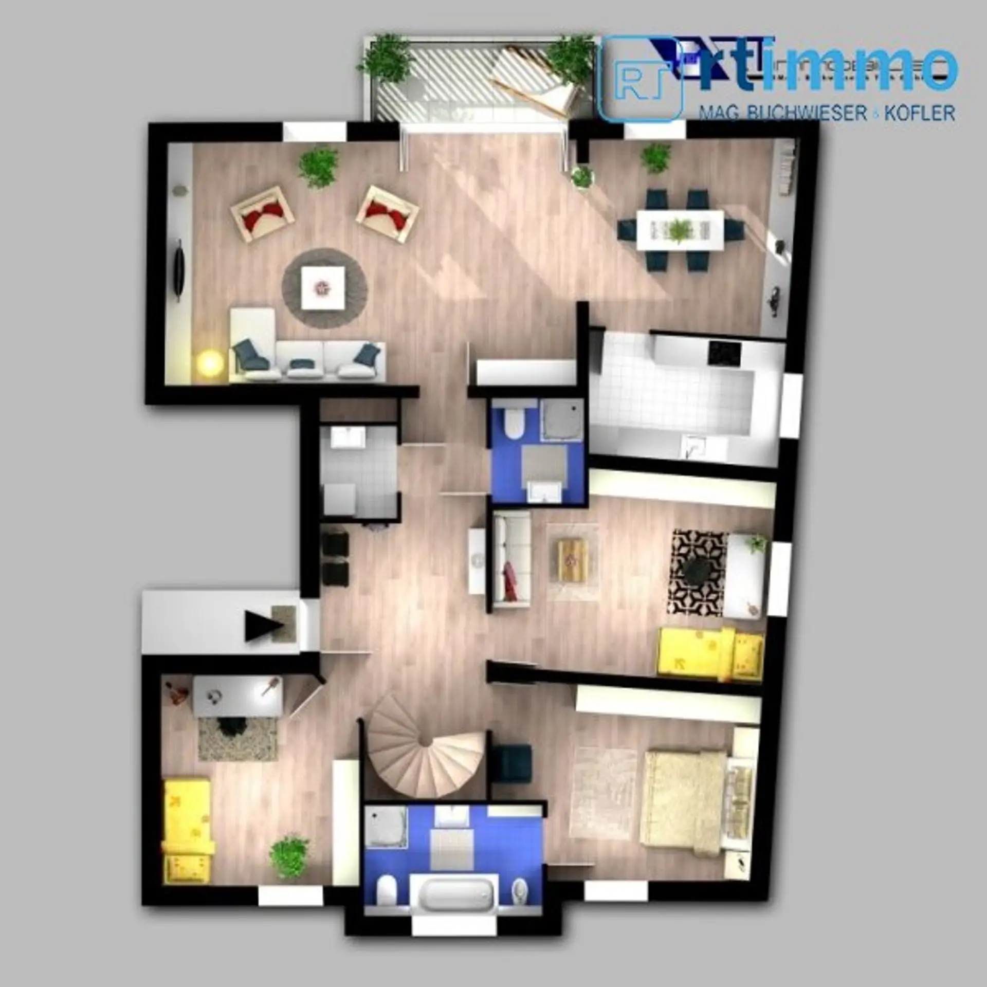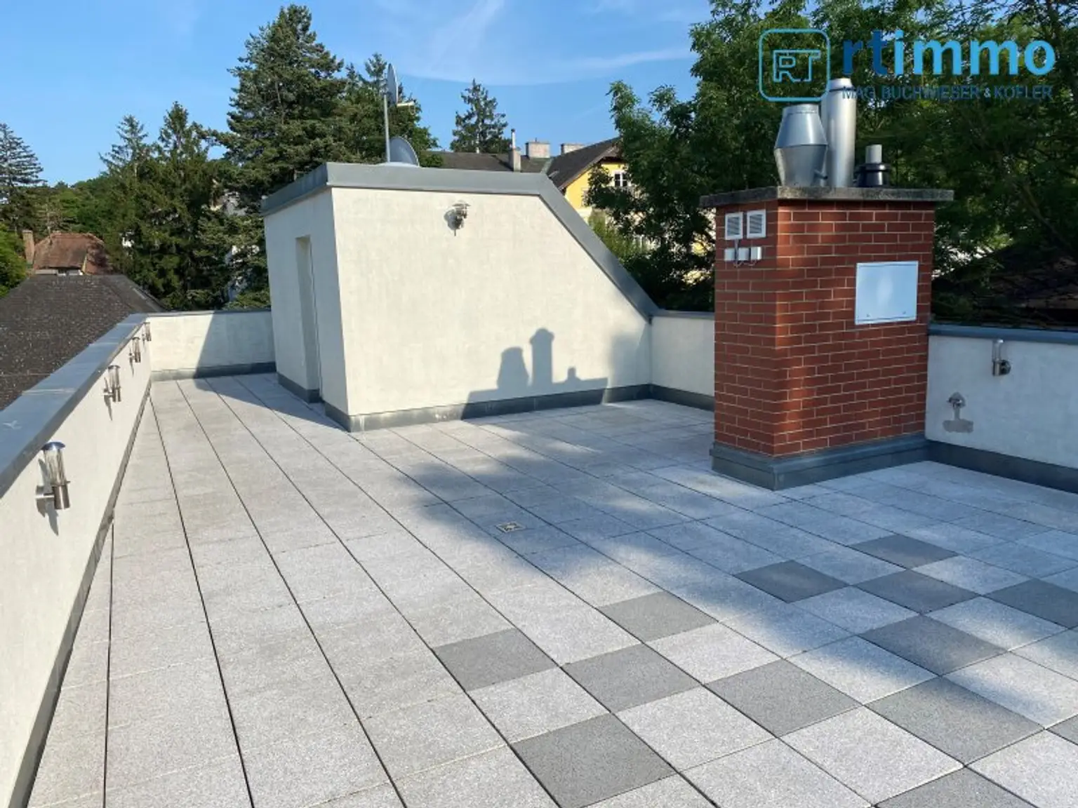 Die Dachterrasse erreichen Sie über eine Wendeltreppe vom Vorzimmer aus, sie ist uneinsehbar und hat einen Rundum-Weitblick. Das größere Bad verfügt über eine Wanne, extra Dusche, großes Fenster, Bidet und WC.