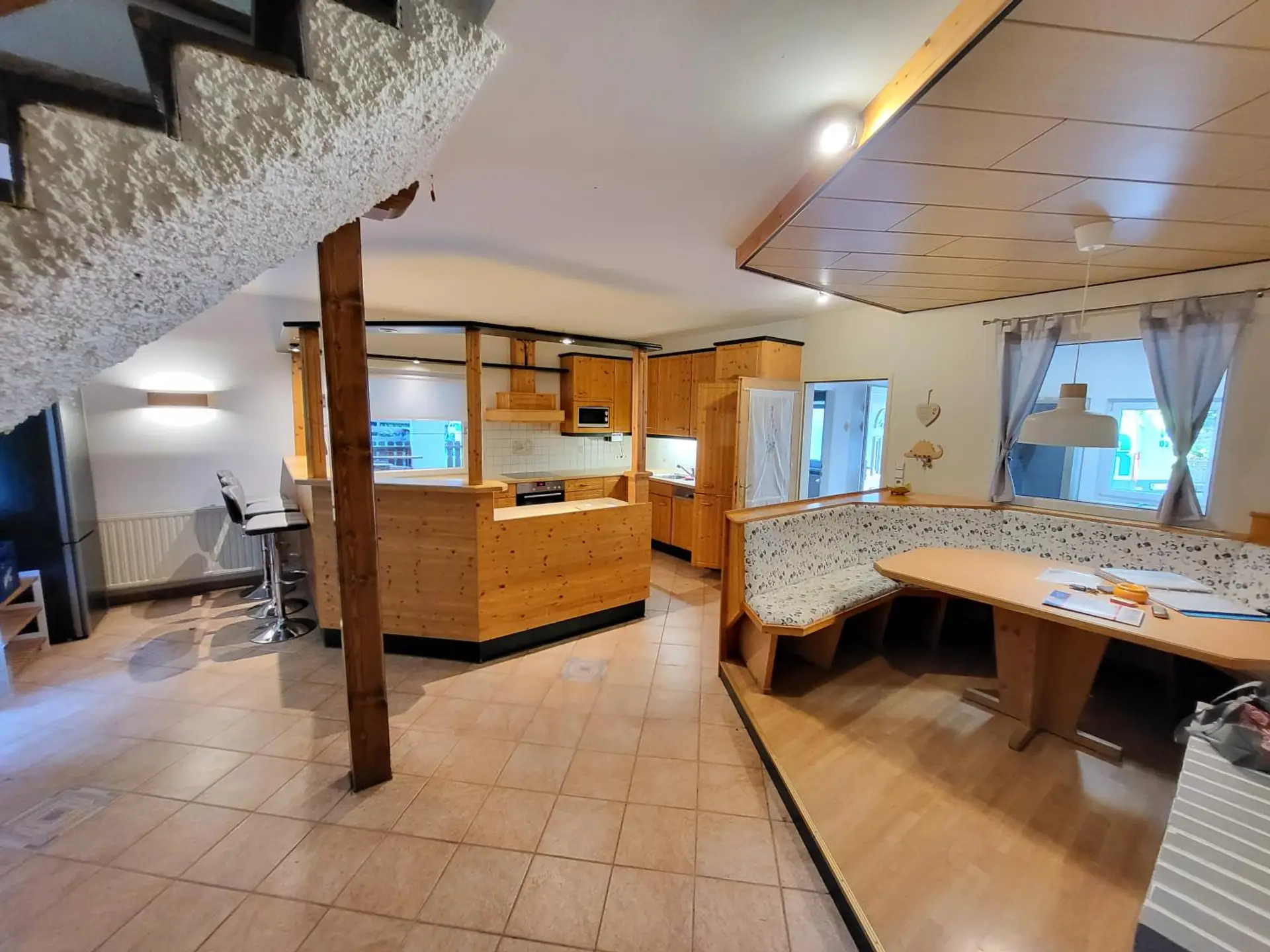 Erdgeschoss: Vorraum, Bad/WC, große Wohnküche mit offenen Kamin und Stiegenaufgang in das Obergeschoss, Heizraum