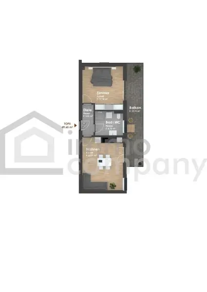 Bei dieser Wohnung bleibt optisch und technisch bestimmt kein Wunsch offen. Die ca. 49,65 m² sind geschickt aufgeteilt. Vom Eingangsbereich geht man rechts in den Wohn-Essbereich, mittig in das Bad und links in das Schlafzimmer.