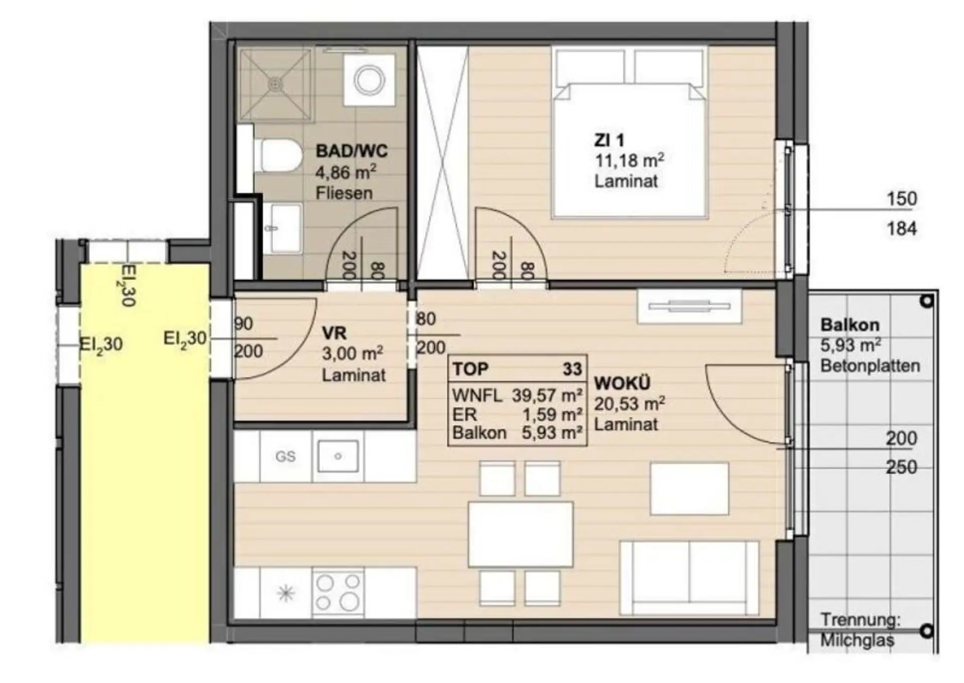 Die ca. 39,6 m² große Wohnung überzeugt mit einem durchdachten Grundriss und einem Balkon, der zusätzlichen Wohnkomfort bietet. Sie verfügt über ein Schlafzimmer, einen Vorraum, ein modernes Badezimmer mit Dusche sowie eine offen gestaltete Wohnküche. Ideal geeignet für Singles oder Paare, die urbanes Wohnen schätzen.