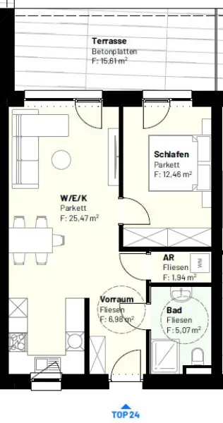 Vorraum – Abstellraum – Bad mit Dusche oder Wanne – separates WC – Wohnküche – Schlafzimmer – Loggia