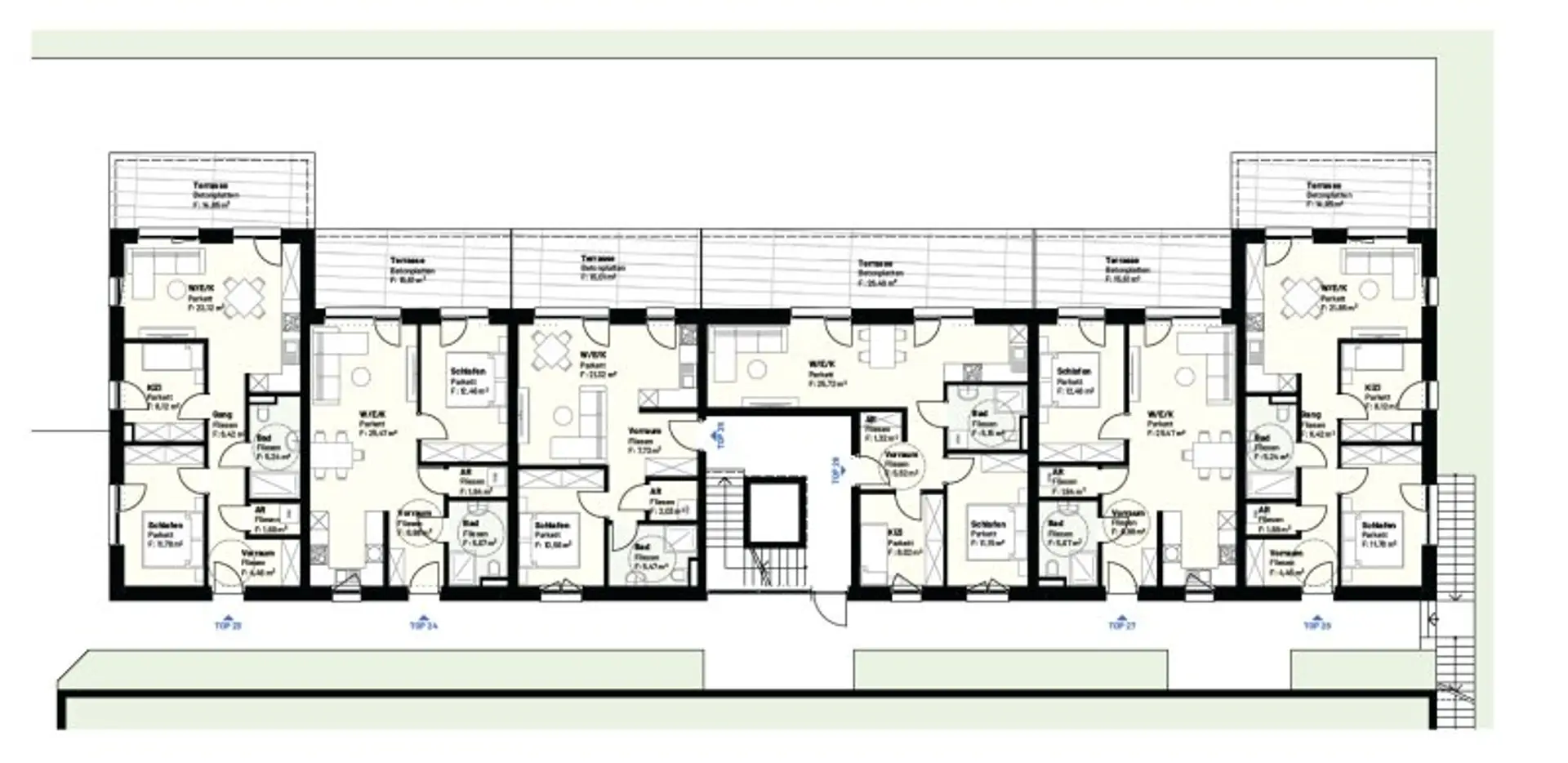 Vorraum – Abstellraum – Bad mit Dusche oder Wanne – separates WC – Wohnküche – Schlafzimmer – Loggia
