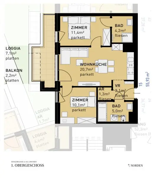 Alle Wohnungen werden schlüsselfertig übergeben, d.h. alle Sanitäranlagen, Fliesen und Parkettböden sind im Kaufpreis inkludiert. Details über die Ausstattung der Wohnungen entnehmen Sie gerne der Leistungsbeschreibung im Booklet.