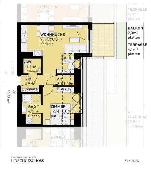 Sollten Sie mehr Platz benötigen, planen wir auch gerne eine größere Wohnung (zB eine 4-Zimmer-Wohnung anstelle von zwei nebeneinander liegenden 2-Zimmer-Wohnungen) für Sie. Fragen Sie einfach bei unserem Vertrieb nach!