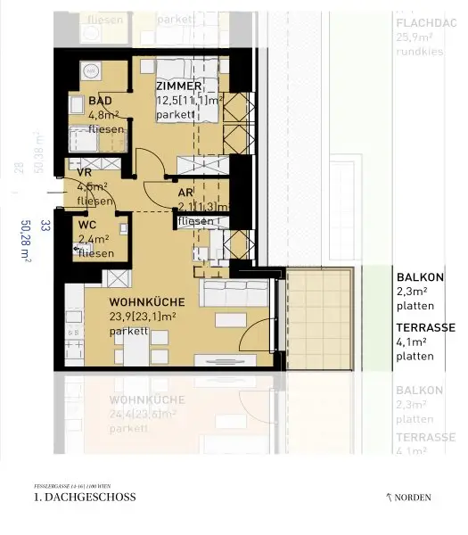 Alle Wohnungen werden schlüsselfertig übergeben, d.h. alle Sanitäranlagen, Fliesen und Parkettböden sind im Kaufpreis inkludiert. Details über die Ausstattung der Wohnungen entnehmen Sie gerne der Leistungsbeschreibung im Booklet.
