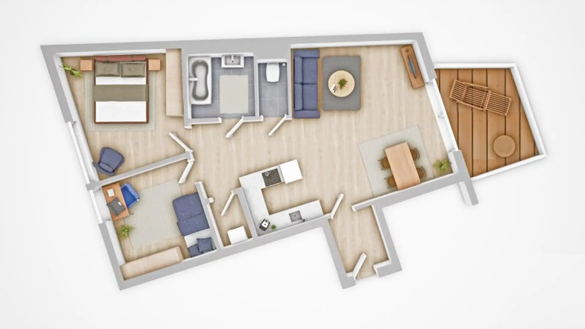 - Vorraum - Wohn/Ess/Küche - Bad mit Badewanne - separates WC - Abstellraum - Schlafzimmer - Kinderzimmer/Büro - Balkon