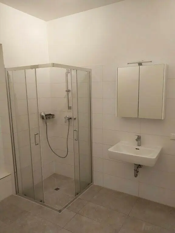 Die Wohnung besteht aus Diele, Wohnraum mit offener Küche, zwei extra begehbaren Zimmern und modernen Duschbad mit WC. (Es gibt kein Kellerabteil.)