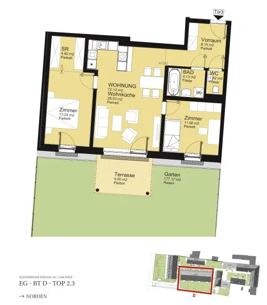 Alle Wohnungen werden schlüsselfertig übergeben, d.h. alle Sanitäranlagen, Fliesen und Parkettböden sind im Kaufpreis inkludiert. Details über die Ausstattung der Wohnungen entnehmen Sie gerne der Leistungsbeschreibung im Booklet.
