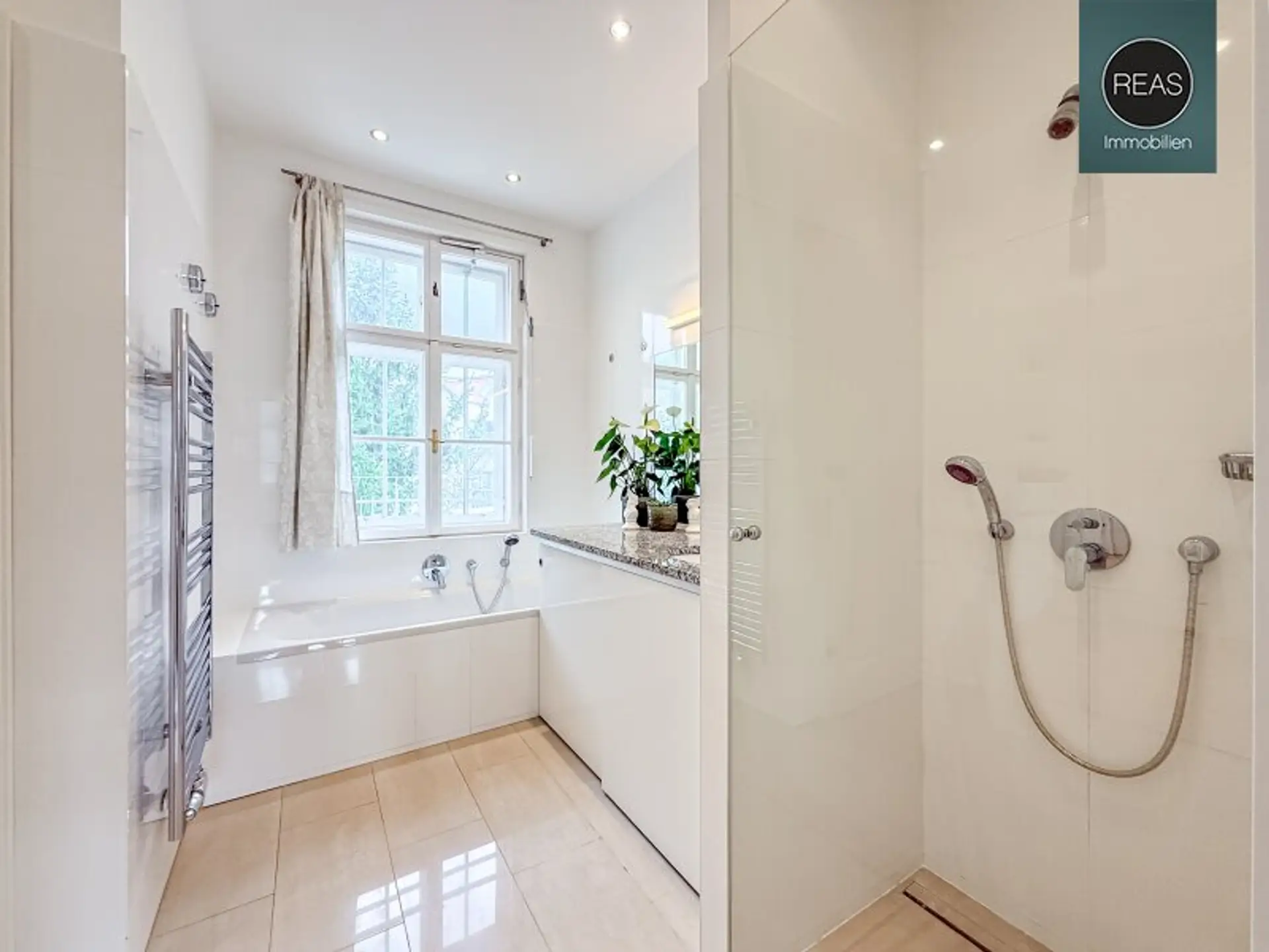 * 1 Badezimmer mit Badewanne, Waschbecken samt Unterschrank und Spiegel, Dusche, Einbauschrank, Waschmaschine, Handtuchheizkörper sowie einem Fenster
