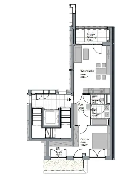 Ein besonderes Highlight ist die uneinsehbare Loggia (ca. 8 m²) – ein privater Rückzugsort im Freien, der das Wohnerlebnis harmonisch erweitert.
