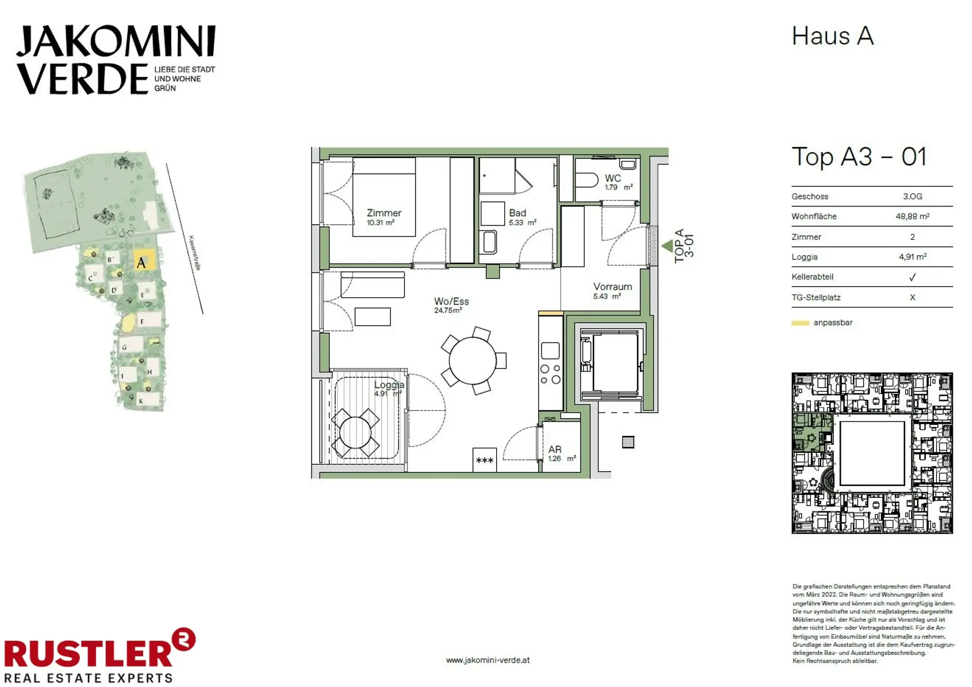 JAKOMINI VERDE - PROVISIONSFREI Modern, hochwertig, nachhaltig - Ihr neues Zuhause im Graz-Jakomini! Entdecken Sie Ihre Traumwohnung im Wohnungsfinder!Jakomini Verde ist ein modernes und nachhaltiges Wohnprojekt im Herzen von Graz, das urbanes Leben mit einer grünen, ruhigen Umgebung vereint. Das gesamte Quartier setzt auf nachhaltige Bauweise und umweltfreundliche Energieversorgung. Durch eine Wasser/Wasser-Wärmepumpe wird das Gebäude effizient beheizt. Zusätzlich wird Fernwärme zur Warmwasserbereitung genutzt, wodurch die Wohneinheiten in den kalten Monaten optimal beheizt und in den heißen Sommermonaten angenehm temperiert werden. Highlights - Moderne Architektur – Lichtdurchflutete Räume, bodentiefe Fenster - Freiflächen für jede Wohnung – Balkon oder Loggia inklusive - Hochwertige Ausstattung – Parkett, Fußbodenheizung, 3-fach-Verglasung - Nachhaltiges Energiekonzept – Wärmepumpe, Fernwärme, PV-Anlage (Mieterstrommodell) - Top-Infrastruktur – Öffis, Einkaufsmöglichkeiten, Naherholung in direkter Nähe - Fahrradfreundlich – direkte Anbindung an das Radwegenetz - Komfort & Barrierefreiheit – Lift, stufenloser Zugang, Tiefgarage verfügbar Wohnungsbeschreibung: Die Wohnung- A3-01 -ist ca. 48,88 m² groß, befindet sich im 3. Stock und hat folgende Räumlichkeiten: - Vorraum - Wohnküche - Schlafzimmer - Badezimmer mit Dusche - separates WC - Abstellraum - Loggia - Kellerabteil - Tiefgaragenplatz (optional)Lage und Infrastruktur: Die Lage von Jakomini Verde könnte nicht besser sein: Die Mur und der Augartenpark mit dem Augartenbad liegen praktisch vor der Tür und bieten zahlreiche Freizeitmöglichkeiten. Der Jakominiplatz ist schnell erreichbar und auch diverse Einkaufsmöglichkeiten sowie Restaurants und Cafés liegen in der Umgebung. Das Quartier ist perfekt in das Radwegenetz der Stadt eingebunden, wodurch umweltfreundliche Mobilität einfach und schnell möglich ist. Hier verbinden sich urbanes Leben und Natur zu einem idealen Zuhause. Beziehbar: ab sofort Überzeugen Sie sich im Zuge einer Besichtigung!