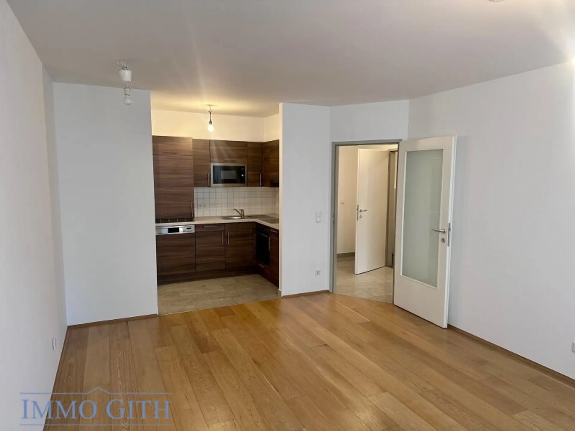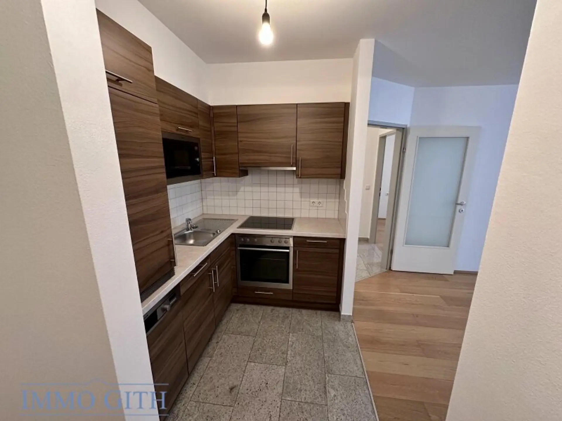 Die Wohnung ist mit Parkettböden in den Wohnräumen sowie zeitlosen Fliesen im Sanitärbereich ausgestattet. Eine voll ausgestattete Einbauküchen-Nische rundet das stimmige Gesamtbild ab.