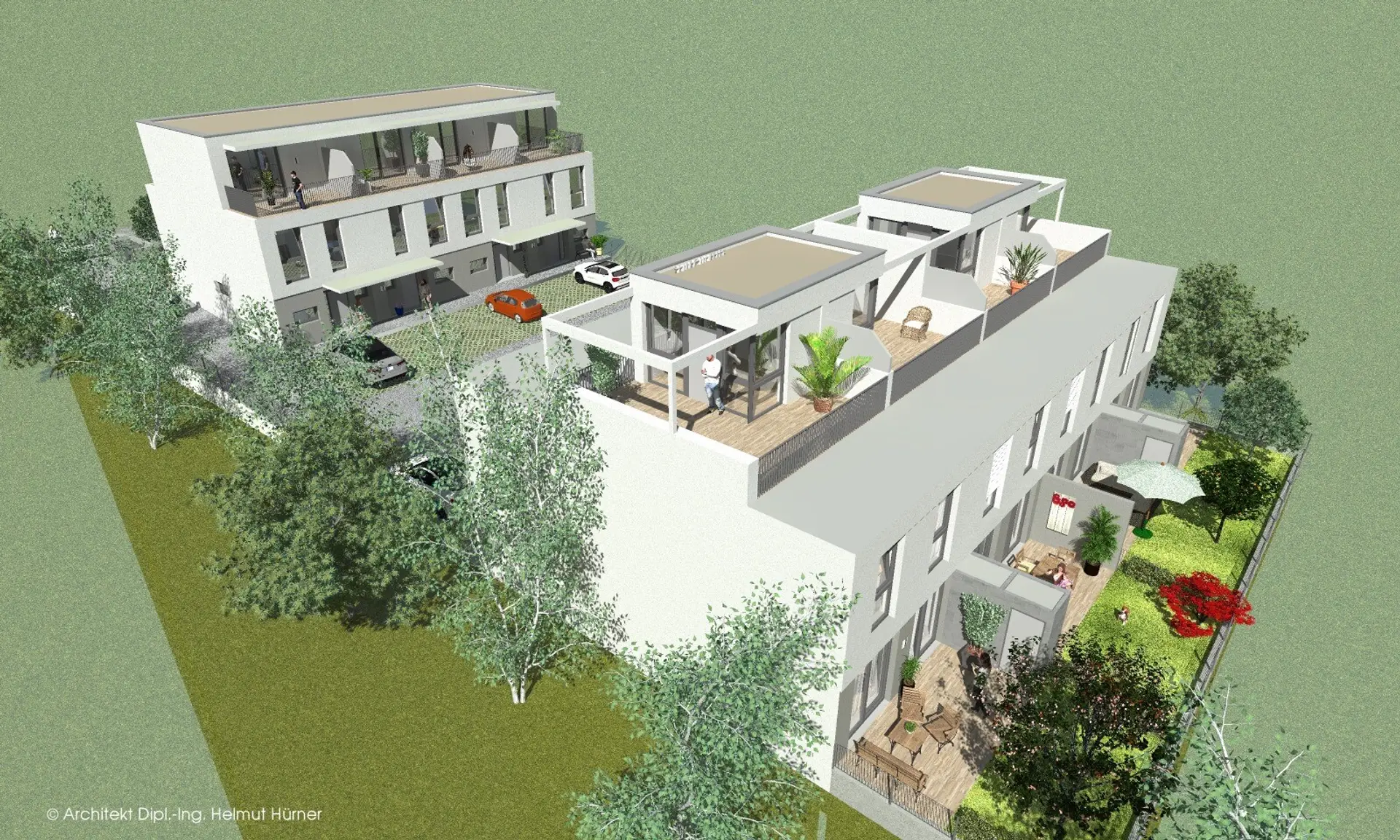Zusätzlich gibt es noch 16 PKW-Stellplätze im Freien vor den Häusern.