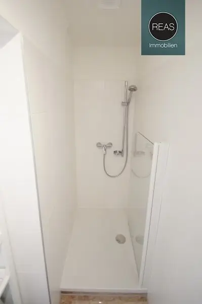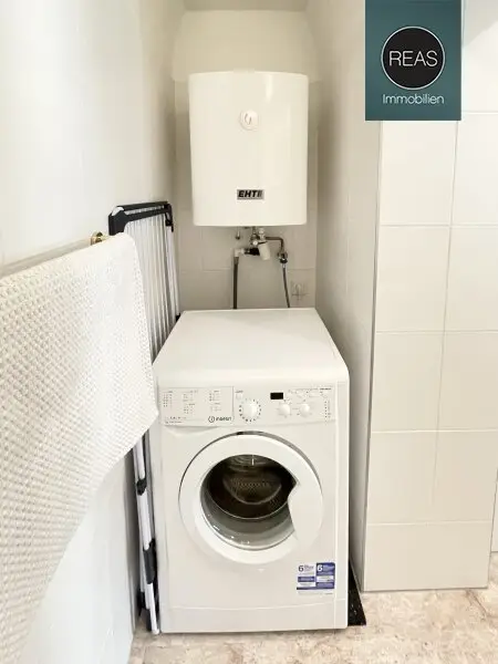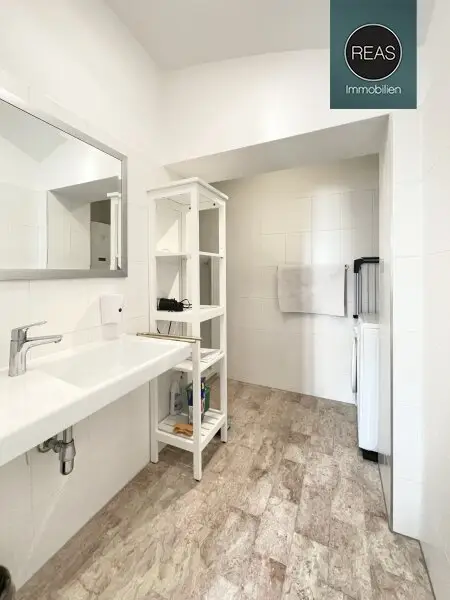 * 1 Bad mit Dusche, Waschbecken, Spiegel und Waschmaschine