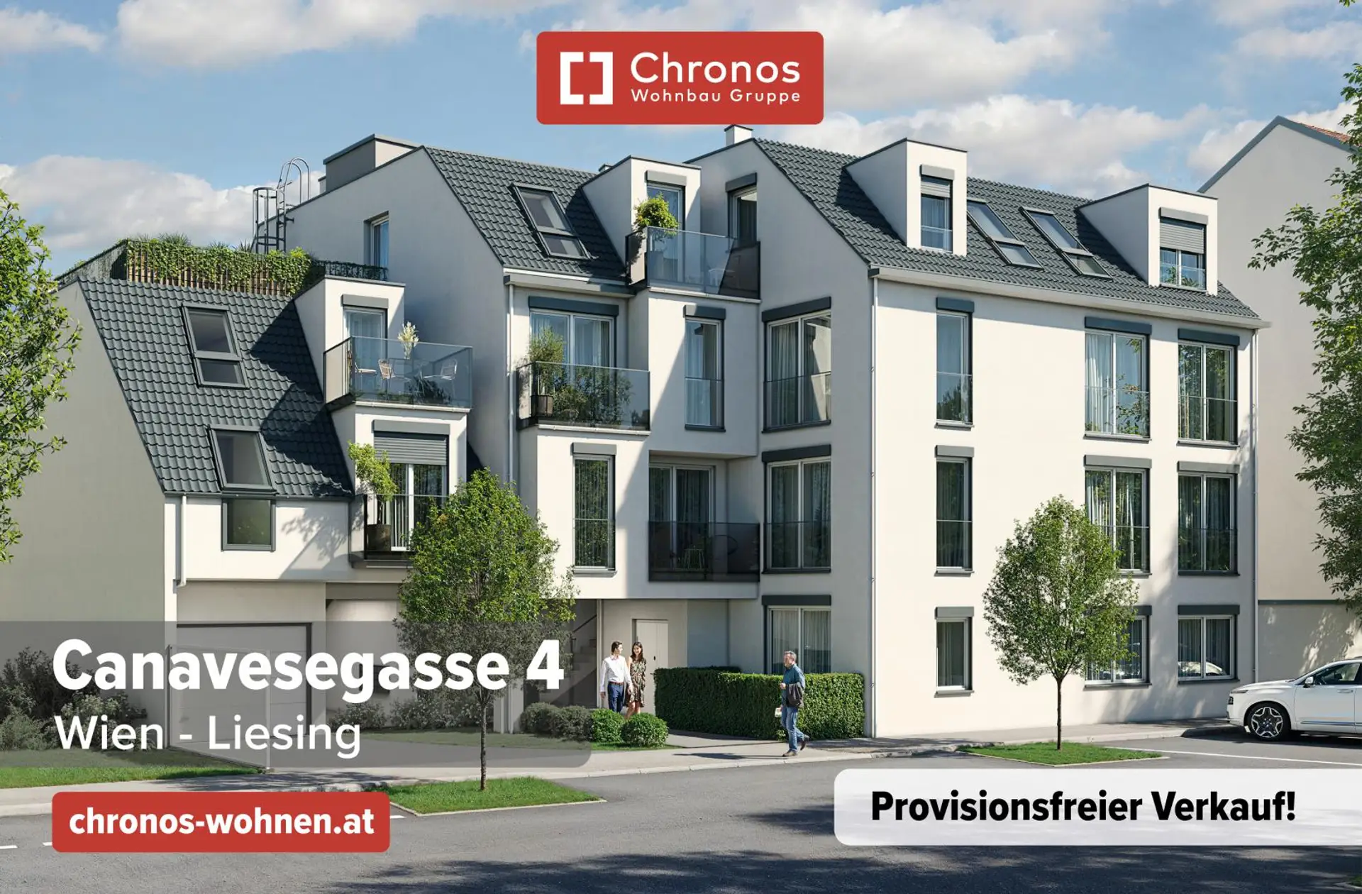 In der Canavesegasse 4 im 23. Wiener Gemeindebezirk Liesing realisiert die Chronos Wohnbau Gruppe ein modernes Neubauprojekt mit 18 Eigentumswohnungen und 4 Gewerbeeinheiten.