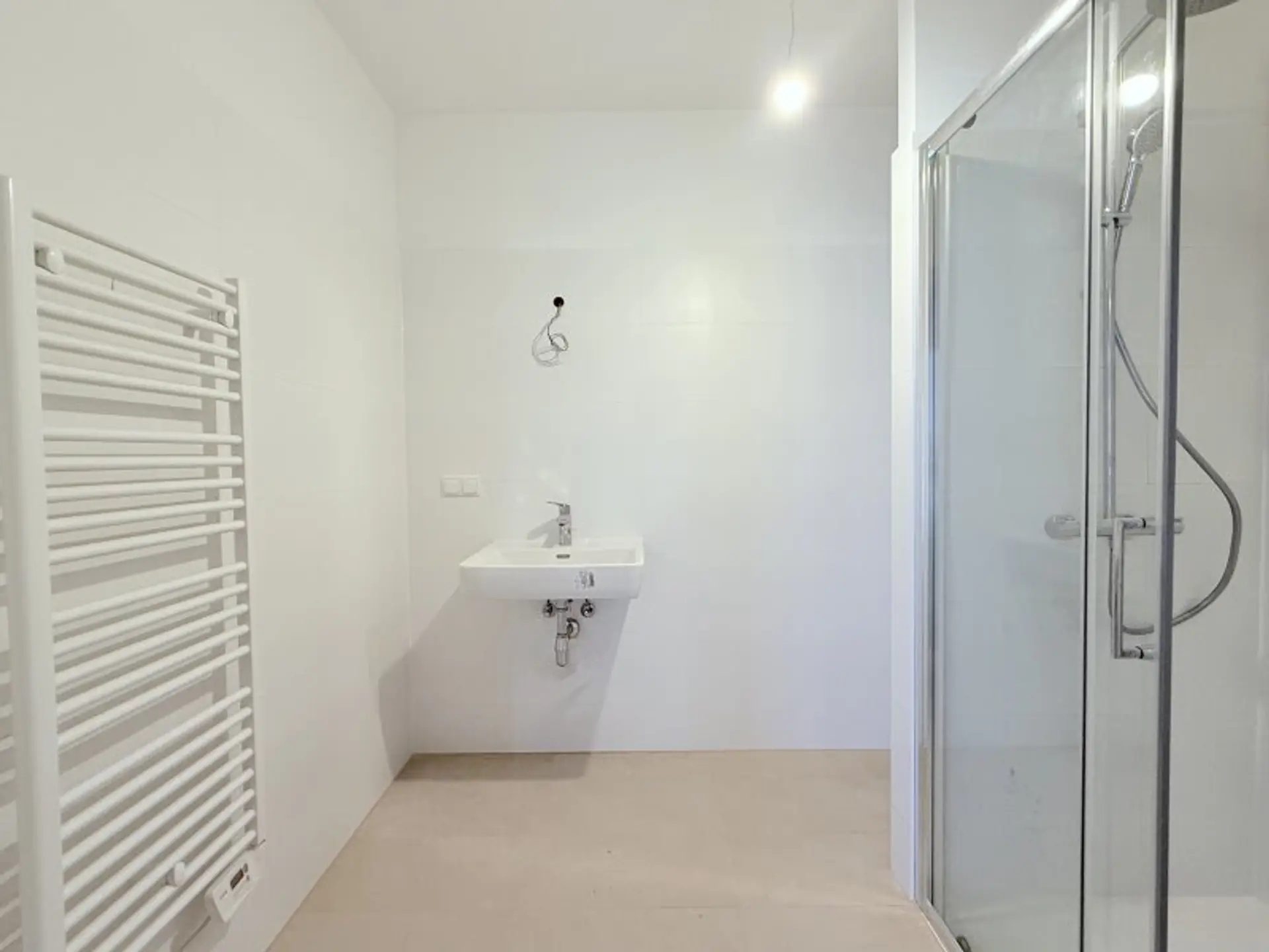 - Badezimmer mit Dusche, Handwaschbecken und Waschmaschinenanschluss