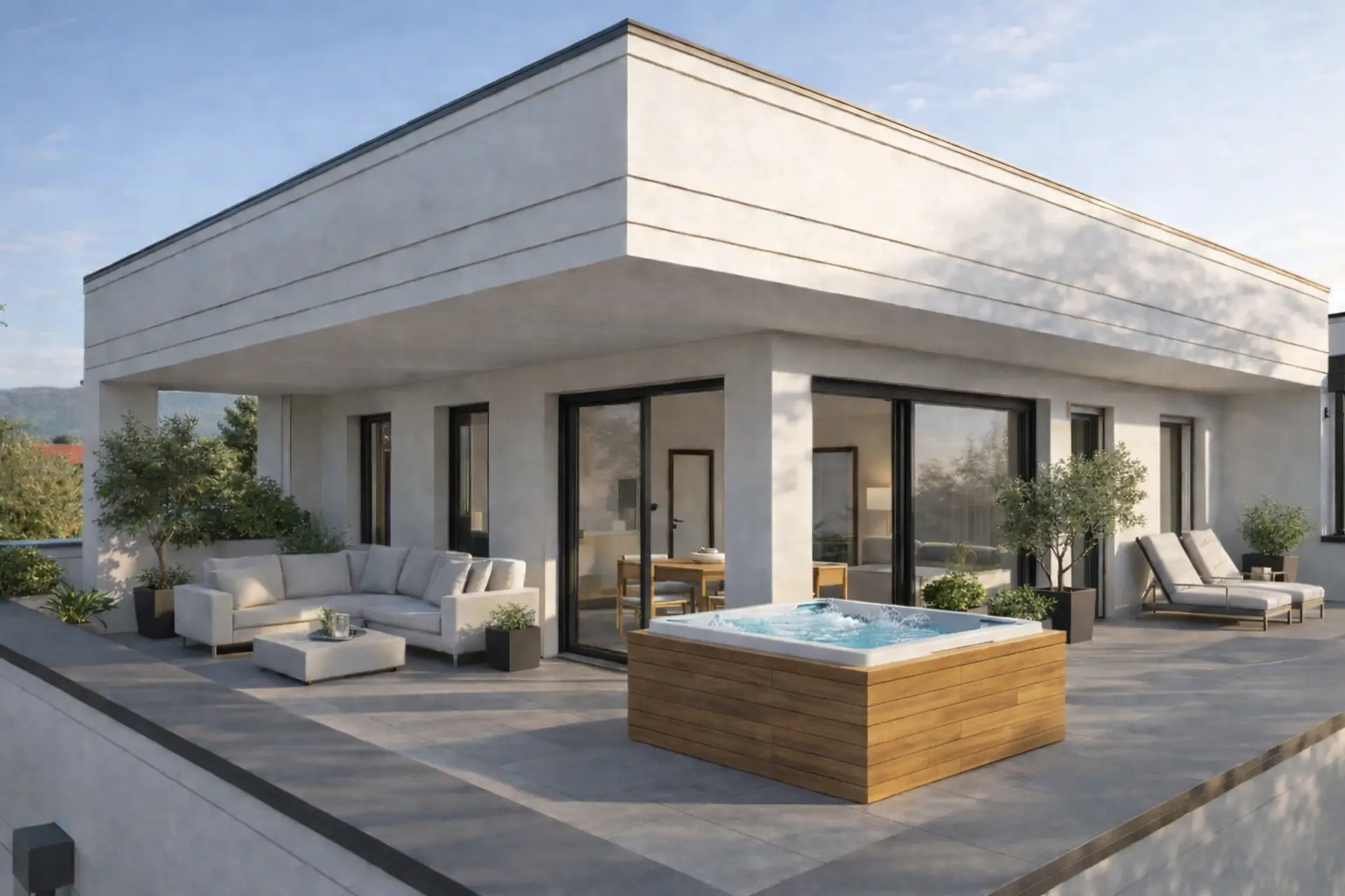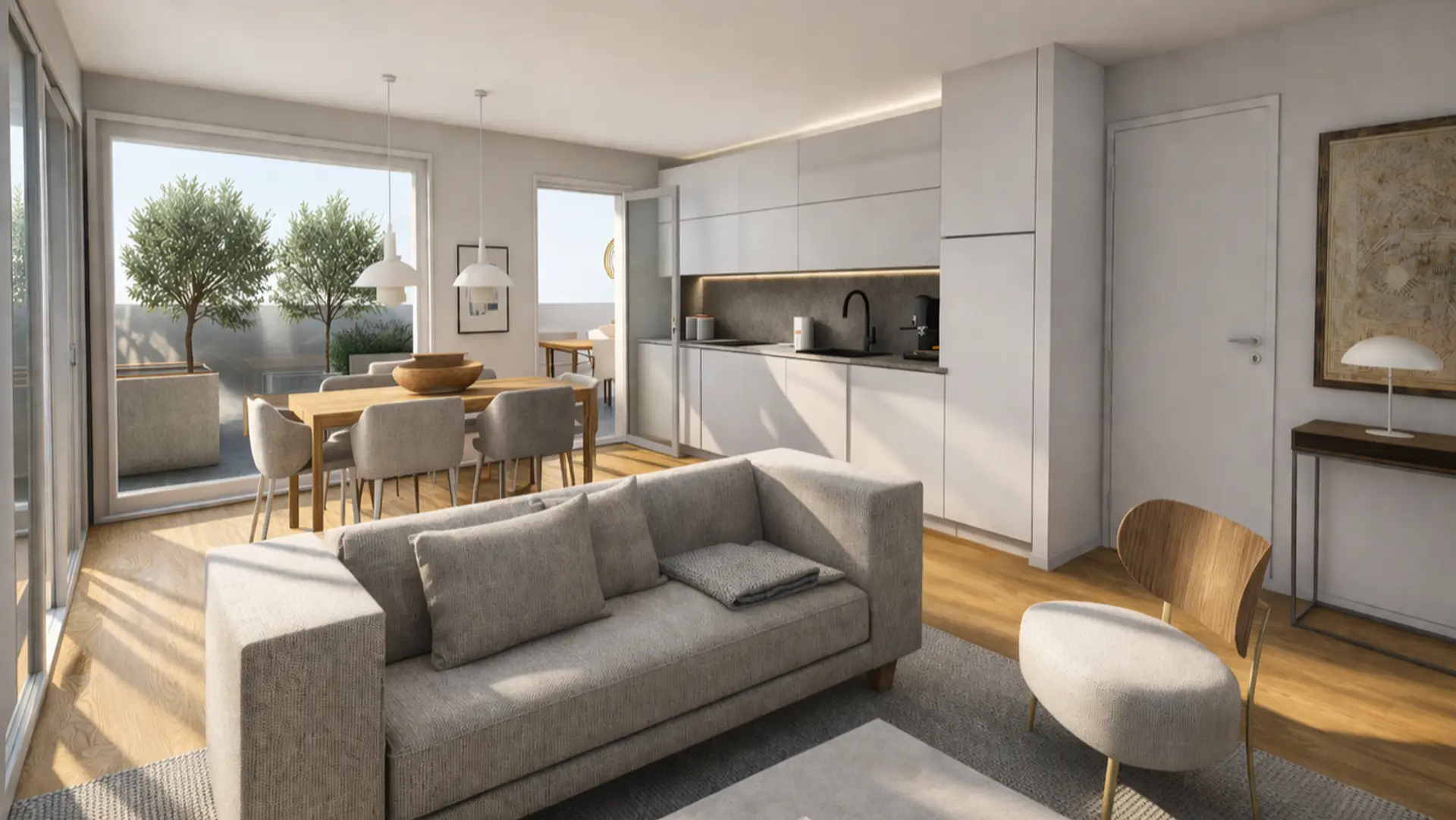 Die 3 Zimmer Wohnung mit ca. 70m² liegt im 2. Stock mit Lift. 2 Schlafzimmer, ein offener Wohn/Kochbereich, eine 82m² Südwest Terrasse, das 7,5m² Bad mit Walk-Inn Dusche sowie Doppelwaschbecken, ein extra WC mit Waschbecken und ein Abstellraum mit Waschmaschinenanschluss laden zum Verweilen ein. Die optionalen Parkplätze sind mit E-Ladegeräten und optionaler Photovoltaik ausgestattet. Die Materialien sind hochwertig und langlebig, die Fenster 3fach verglast und beschattet, die Glaselemente bieten eine großzügige Sicht ins Grün. Geheizt wird mittels Luftwärmepumpe und Fußbodenheizung.