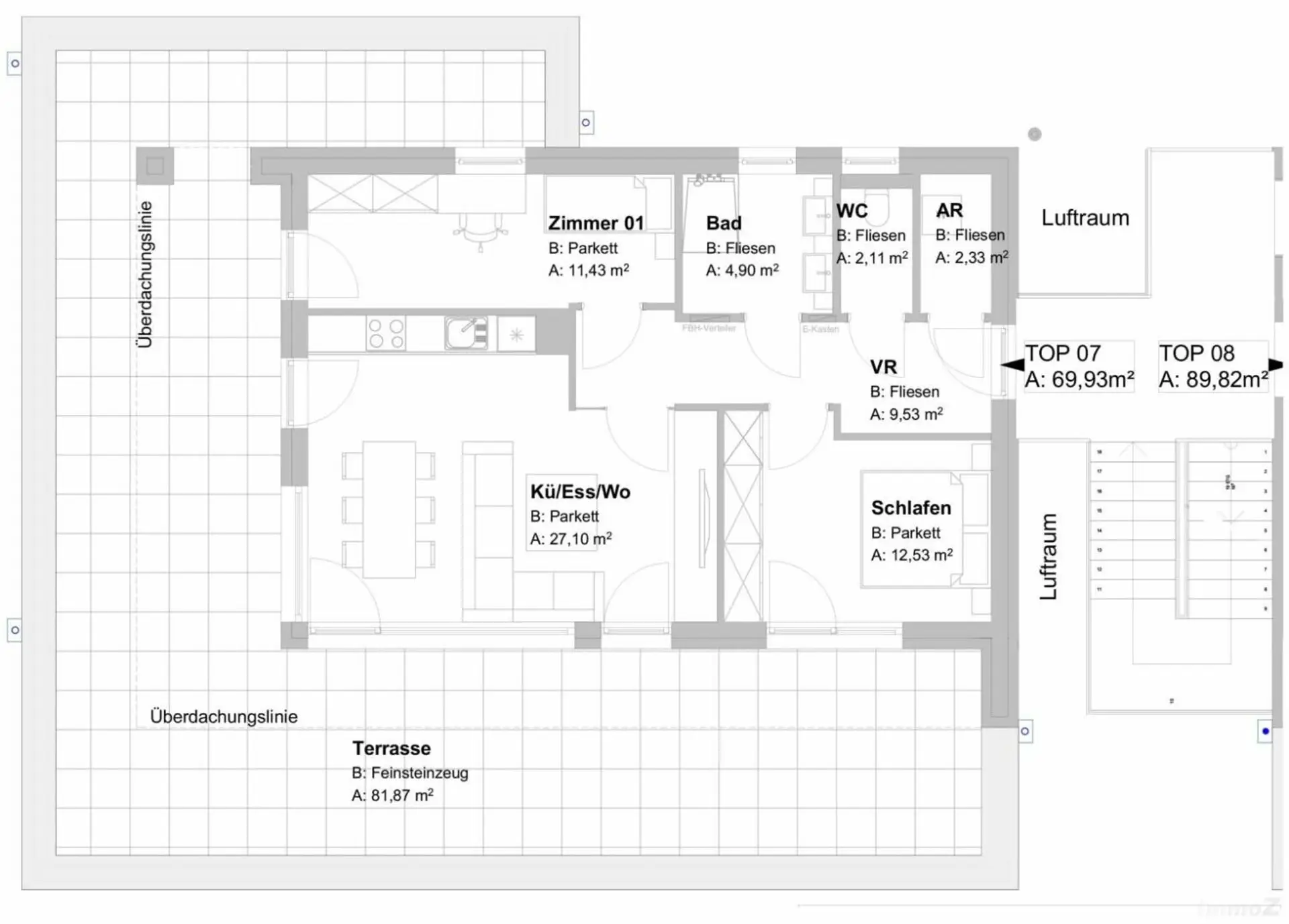 Zum Verkauf steht eine besondere Penthouse Wohnung in der ruhigen Laubgasse nahe dem Erholungsgebiet an der Mur. Die kleine Anlage mit nur 8 Einheiten wird von der Baufirma Pfleger errichtet und zeichnet sich durch Ihre Ausrichtung nach Süden und die kleinstrukturierte Nachbarschaft aus.