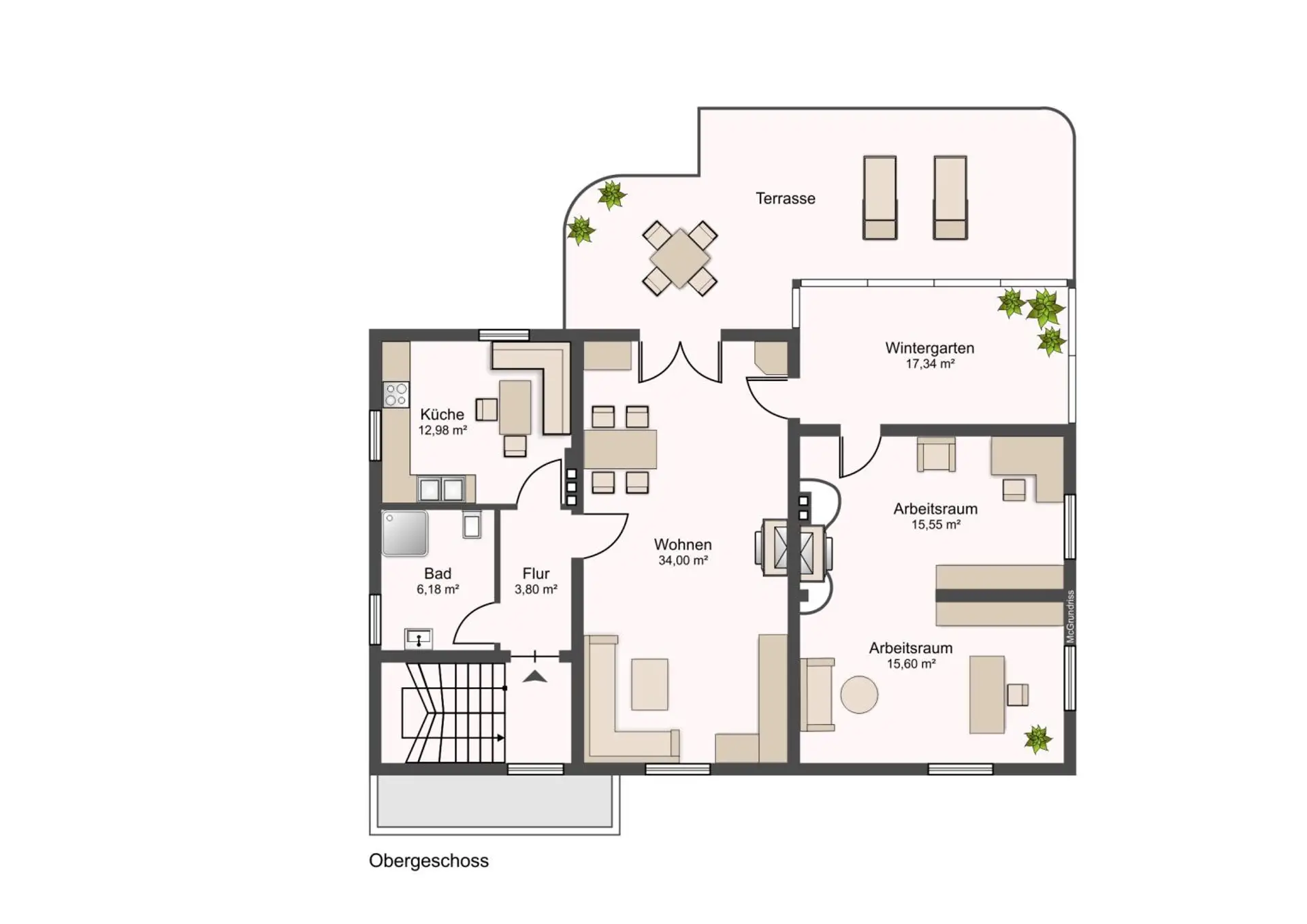 - Obergeschoss/Dachgeschoss: großzügige Maisonette-Wohnung mit ca. 200 m², Wintergarten über zwei Etagen und beeindruckender Glasfront sowie zusätzlichem Lesebalkon.