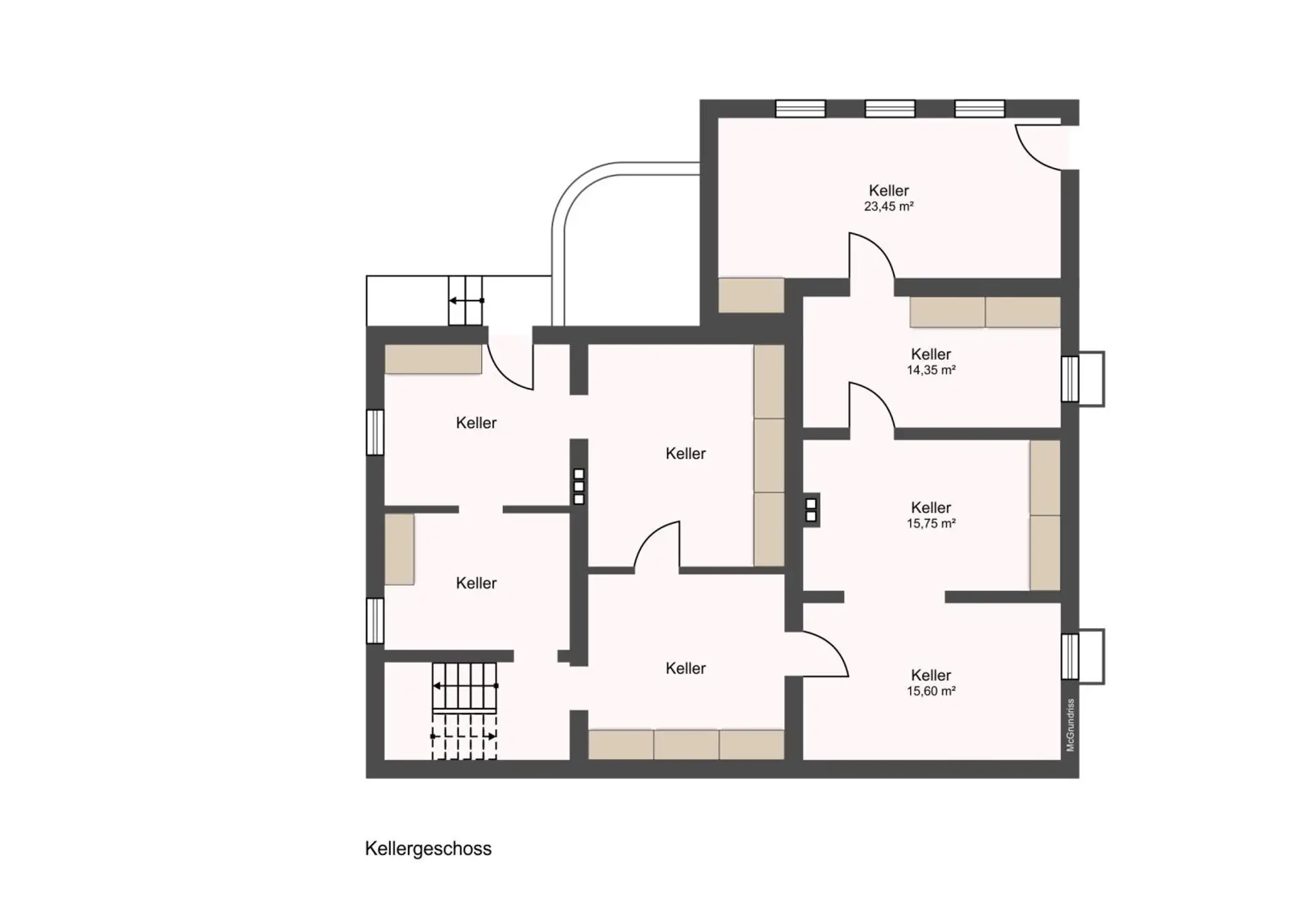 Der gesamte Gebäudetrakt inklusive Terrasse ist unterkellert; auch eine Hälfte der Doppelgarage verfügt über einen Kellerbereich. Die vorderen Kellerräume liegen über Gartenniveau und sind bereits mit Heizkörpern ausgestattet – ideal für Hobby, Lager oder zusätzliche Nutzungsmöglichkeiten. Zwei direkte Kellerausgänge führen in den liebevoll angelegten Garten mit Nussbaum und Obstbäumen.