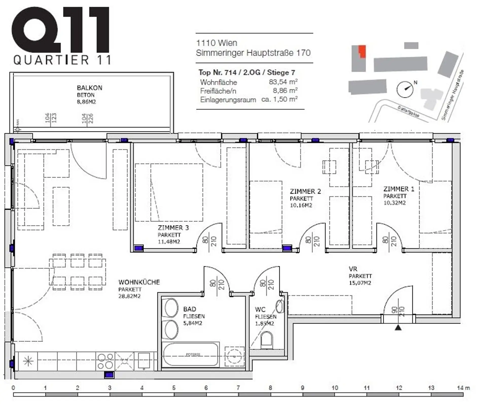 In zentraler Lage von Simmering befindet sich Ihr neues Zuhause mit Blick ins Grüne! Das moderne und weitläufige Wohnbauprojekt besteht aus gesamt 12 Stiegen. Die gut gestalteten 1-4 Zimmerwohnungen verfügen alle über Freiflächen in Form von Balkonen, Loggien oder Terrassen und sind allesamt mit einer effizienten Deckenkühlung ausgestattet. Bitte beachten Sie, dass die Wohnung derzeit noch bewohnt ist und es sich bei den Bildern um Archivfotos handelt. Die Wohnung: Diese helle und moderne 4-Zimmer-Balkonwohnung mit einer Wohnfläche von ca. 84 m² und einer Freifläche von ca. 9 m² steht für Sie nach Vereinbarung zur Anmietung bereit. Im 2. Obergeschoss erwartet Sie die Immobilie mit einer hochwertigen Ausstattung und einer durchdachten Raumaufteilung. Die Highlights: Parkettböden / Isolierglasfenster / KlimaLoop® - Deckenkühlung / Außenliegende Jalousien (mechanisch) / Fernseh- und Internetanschlüsse (Magenta) Die Wohnhausanlage: Ebenerdig begehbare Kinderwagen- und Fahrradabstellräume / Waschküche / Spielplatz im Freien / Kellerabteil zu jeder Wohnung zugeordnet / Barrierefreier Zugang zur Wohnung (Aufzug) / Garage Infrastruktur: Die U-Bahn-Station "Simmering" (U3) sowie Straßenbahnen und Busse sind in wenigen Minuten zu Fuß erreichbar. Geschäfte des täglichen Bedarfs befinden sich in unmittelbarer Nähe (Simmeringer Hauptstraße). Das Einkaufszentrum Simmering ist per Straßenbahn in wenigen Minuten erreichbar und ergänzt das Einkaufsangebot. Die Kosten: Der monatliche Gesamtmietzins dieser Wohnung beläuft sich auf Euro 1.542,71 inklusive Betriebskosten und Umsatzsteuer. Vertragsgebühren und Akontozahlungen (z.B. Betriebskosten) können sich per Jahreswechsel ändern. Die Heiz- und Warmwasserversorgung erfolgt mittels Fußbodenheizung, ist im Mietpreis nicht inkludiert und wird Verbrauchsabhängig vorgeschrieben. Die Stellplätze in der hauseigenen Garage können optional um jeweils EURO 80,- inklusive Betriebskosten und USt. angemietet werden. Per Telefon werden keine Termine vergeben! Wir bitten Sie, ausschließlich das Kontaktformular der Immobilienplattformen für Anfragen zu nutzen. Nach Erhalt unserer E-Mail antworten Sie bitte auf dieses E-Mail mit Ihrem Besichtigungswunsch.