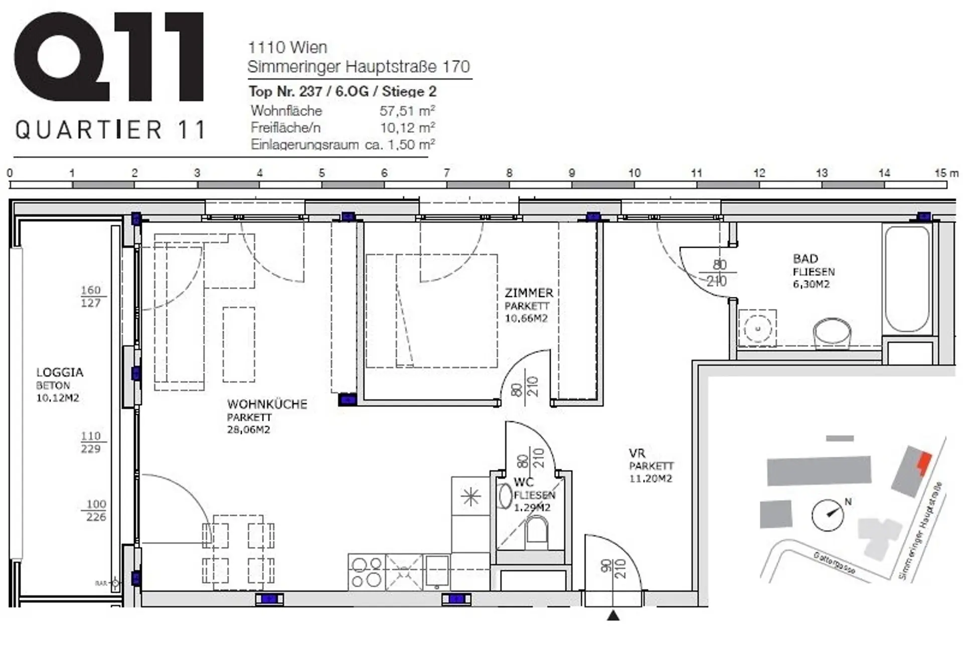 In zentraler Lage von Simmering befindet sich Ihr neues Zuhause mit Blick ins Grüne! Das moderne und weitläufige Wohnbauprojekt besteht aus gesamt 12 Stiegen. Die gut gestalteten 1-4 Zimmerwohnungen verfügen alle über Freiflächen in Form von Balkonen, Loggien oder Terrassen und sind allesamt mit einer effizienten Deckenkühlung ausgestattet.Bitte beachten Sie, dass die Wohnung derzeit noch bewohnt ist und es sich bei den Bildern um Archivfotos handelt.Die Wohnung: Diese helle und moderne 2-Zimmer-Loggiawohnung mit einer Wohnfläche von ca. 58 m² und einer Freifläche von ca. 10 m² steht für Sie nach Vereinbarung zur Anmietung bereit. Im 6. Obergeschoss erwartet Sie die Immobilie mit einer hochwertigen Ausstattung und einer durchdachten Raumaufteilung. Die Highlights: Parkettböden / Isolierglasfenster / KlimaLoop® - Deckenkühlung / Außenliegende Jalousien (mechanisch) / Fernseh- und Internetanschlüsse (Magenta) Die Wohnhausanlage: Ebenerdig begehbare Kinderwagen- und Fahrradabstellräume / Waschküche / Spielplatz im Freien / Kellerabteil zu jeder Wohnung zugeordnet / Barrierefreier Zugang zur Wohnung (Aufzug) / Garage Infrastruktur:Die U-Bahn-Station "Simmering" (U3) sowie Straßenbahnen und Busse sind in wenigen Minuten zu Fuß erreichbar. Geschäfte des täglichen Bedarfs befinden sich in unmittelbarer Nähe (Simmeringer Hauptstraße). Das Einkaufszentrum Simmering ist per Straßenbahn in wenigen Minuten erreichbar und ergänzt das Einkaufsangebot.Die Kosten: Der monatliche Gesamtmietzins dieser Wohnung beläuft sich auf Euro 1.247,49 inklusive Betriebskosten und Umsatzsteuer. Die Heiz- und Warmwasserversorgung erfolgt mittels Fußbodenheizung, ist im Mietpreis nicht inkludiert und wird Verbrauchsabhängig vorgeschrieben. Die Stellplätze in der hauseigenen Garage können optional angemietet werden. Per Telefon werden keine Termine vergeben! Wir bitten Sie, ausschließlich das Kontaktformular der Immobilienplattformen für Anfragen zu nutzen. Nach Erhalt unserer E-Mail antworten Sie bitte auf dieses E-Mail mit Ihrem Besichtigungswunsch.Wir möchten darauf hinweisen, dass unsere Antwort möglicherweise in Ihrem Spamordner landen könnte. Wir freuen uns auf Ihre Anfrage und einen gemeinsamen Besichtigungstermin!