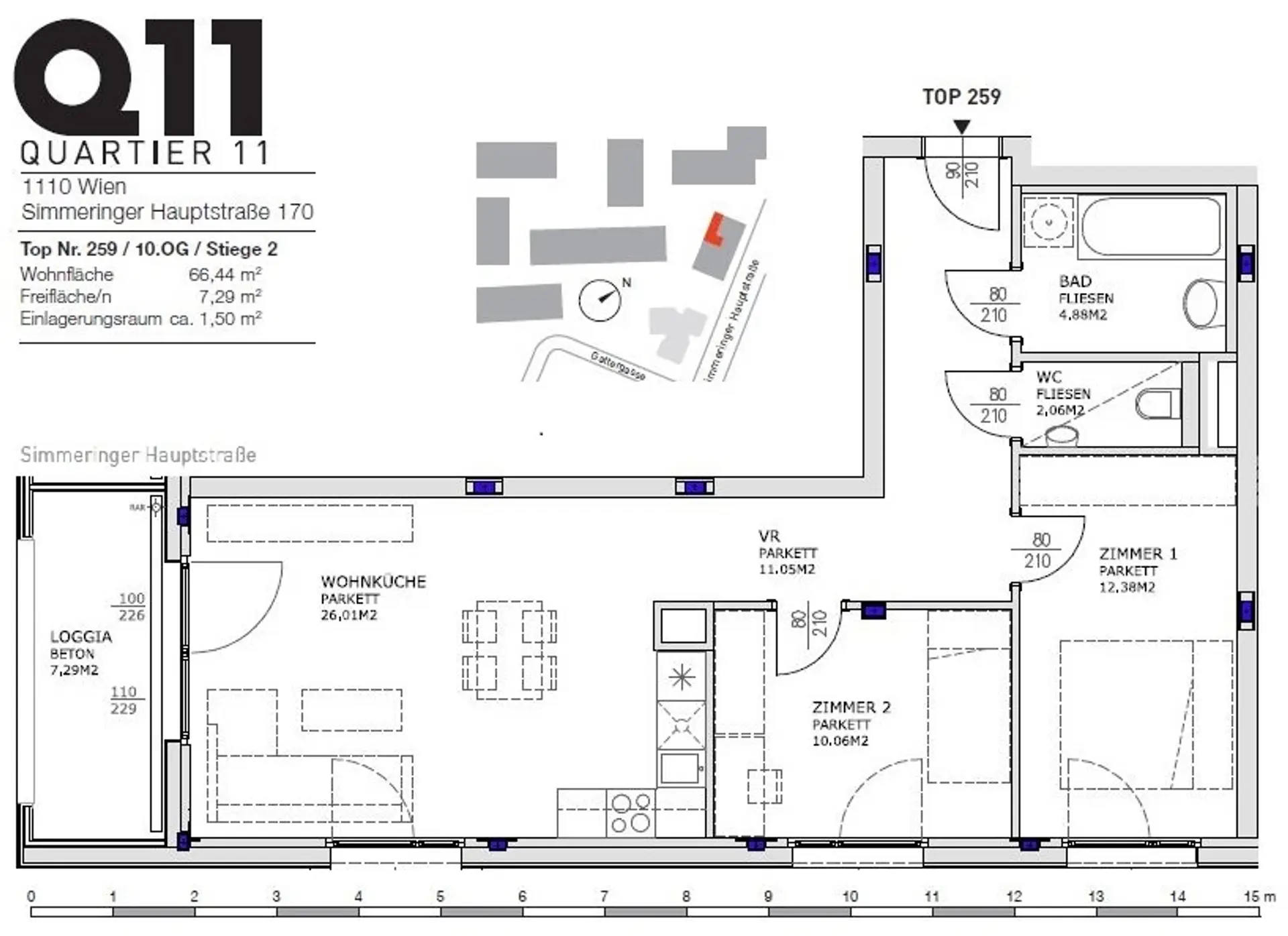 In zentraler Lage von Simmering befindet sich Ihr neues Zuhause mit Blick ins Grüne! Das moderne und weitläufige Wohnbauprojekt besteht aus gesamt 12 Stiegen. Die gut gestalteten 1-4 Zimmerwohnungen verfügen alle über Freiflächen in Form von Balkonen, Loggien oder Terrassen und sind allesamt mit einer effizienten Deckenkühlung ausgestattet. Die Wohnung: Diese helle und moderne 3-Zimmer-Loggiawohnung mit einer Wohnfläche von ca. 66,5 m² und einer Freifläche von ca. 7 m² (norwestseitig) steht für Sie nach Vereinbarung zur Anmietung bereit. Im 10. Obergeschoss erwartet Sie die Immobilie mit einer hochwertigen Ausstattung und einer durchdachten Raumaufteilung. Die Highlights: Parkettböden / Isolierglasfenster / KlimaLoop® - Deckenkühlung / Außenliegende Jalousien (mechanisch) / Fernseh- und Internetanschlüsse (Magenta) Die Wohnhausanlage: Ebenerdig begehbare Kinderwagen- und Fahrradabstellräume / Waschküche / Spielplatz im Freien / Kellerabteil zu jeder Wohnung zugeordnet / Barrierefreier Zugang zur Wohnung (Aufzug) / Garage Infrastruktur: Die U-Bahn-Station "Simmering" (U3) sowie Straßenbahnen und Busse sind in wenigen Minuten zu Fuß erreichbar. Geschäfte des täglichen Bedarfs befinden sich in unmittelbarer Nähe (Simmeringer Hauptstraße). Das Einkaufszentrum Simmering ist per Straßenbahn in wenigen Minuten erreichbar und ergänzt das Einkaufsangebot. Die Kosten: Der monatliche Gesamtmietzins dieser Wohnung beläuft sich auf Euro 1.449,00 inklusive Betriebskosten und Umsatzsteuer. Vertragsgebühren und Akontozahlungen (z.B. Betriebskosten) können sich per Jahreswechsel ändern. Die Heiz- und Warmwasserversorgung erfolgt mittels Fußbodenheizung, ist im Mietpreis nicht inkludiert und wird Verbrauchsabhängig vorgeschrieben. Die Stellplätze in der hauseigenen Garage können optional angemietet werden. Per Telefon werden keine Termine vergeben! Wir bitten Sie, ausschließlich das Kontaktformular der Immobilienplattformen für Anfragen zu nutzen. Nach Erhalt unserer E-Mail antworten Sie bitte auf dieses E-Mail mit Ihrem Besichtigungswunsch. Wir möchten darauf hinweisen, dass unsere Antwort möglicherweise in Ihrem Spamordner landen könnte. Wir freuen uns auf Ihre Anfrage und einen gemeinsamen Besichtigungstermin!