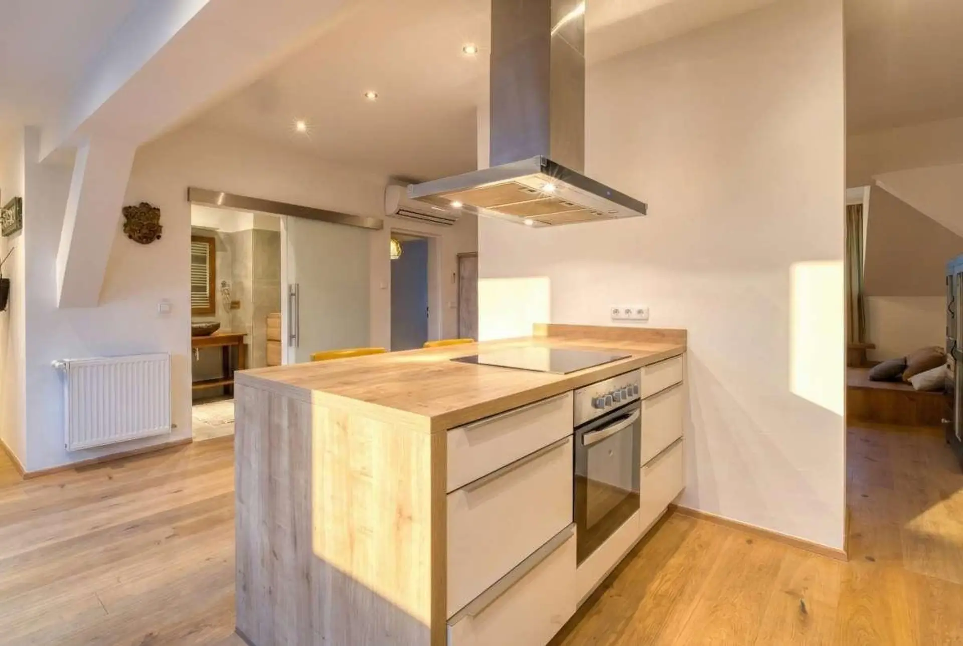 moderne, voll ausgestattete Küche (Herd, Backofen, Geschirrspüler, Kühlschrank)