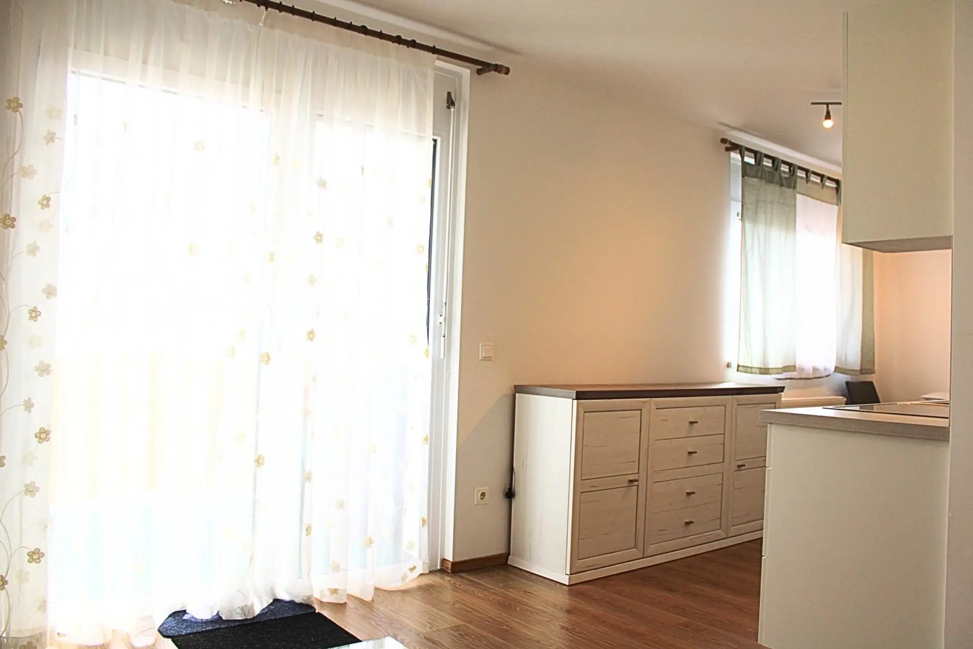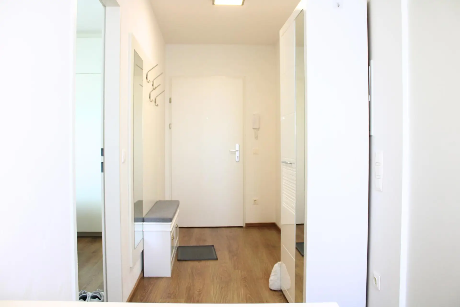 Über einen geräumigen Vorraum gelangen Sie linker Hand in das ca. 6 m² große Badezimmer mit Badewanne, Waschmaschine sowie Toilette. Rechter Hand befindet sich das ca. 10,5 m² große Schlafzimmer mit Doppelbett und Einbauschränken. Geradeaus und anschließend links erreichen Sie den großen, lichtdurchfluteten Wohn-/Essbereich mit voll ausgestatteter Einbauküche vom Tischler sowie den Wohnbereich mit Ausgang auf den ca. 4,5 m² großen Balkon. Alle Wohnräume sind mit hochwertigem Eichenparkett ausgestattet, das Badezimmer mit Fliesen.